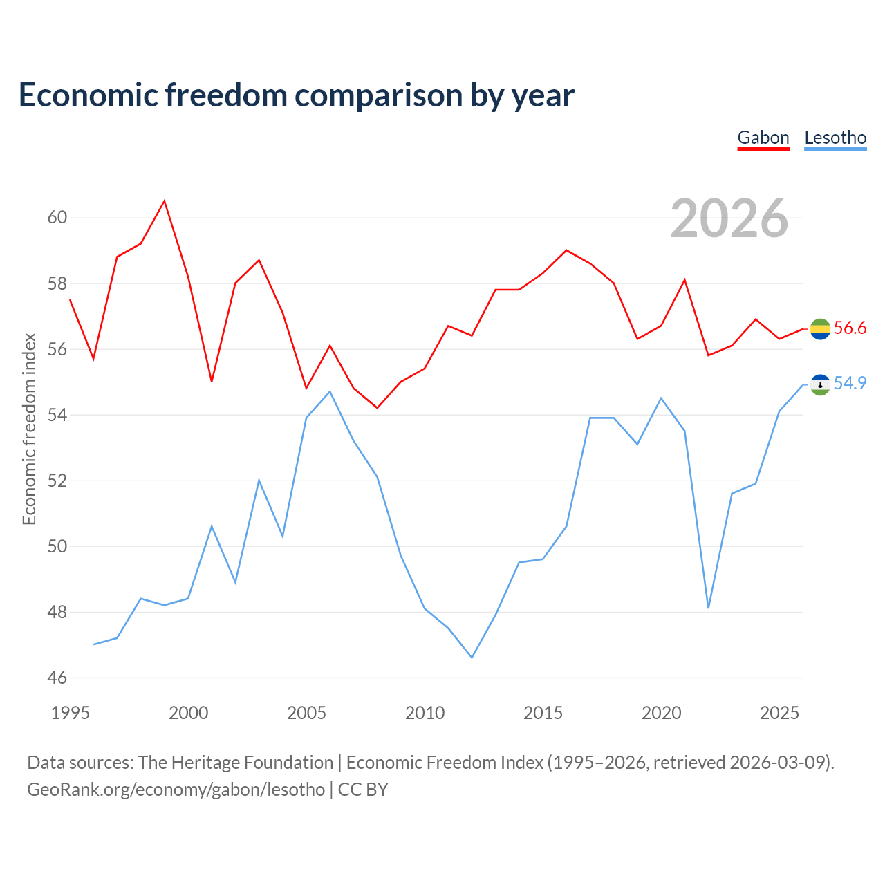The Economic Freedom Index for Gabon is 56.6, ranking 120/197, compared to 54.9 for Lesotho, ranking 130/197. The chart above displays a comparison of annual changes in economic freedom indexes.