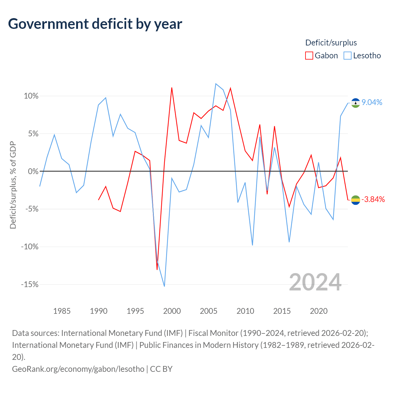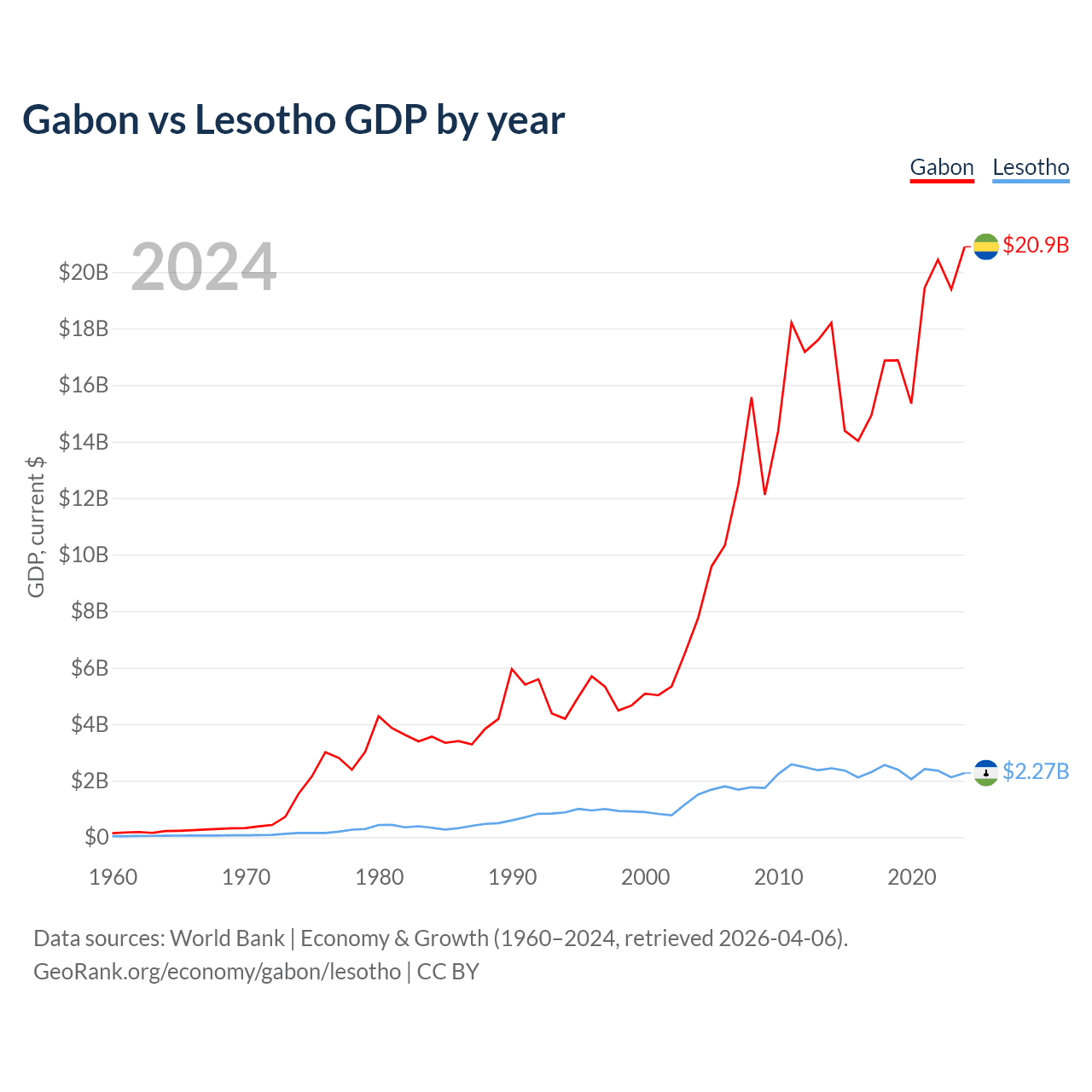 Gabon has a GDP of $20.9B compared to $2.27B for Lesotho, ranking 127/197 and 175/197 by economy size, respectively.