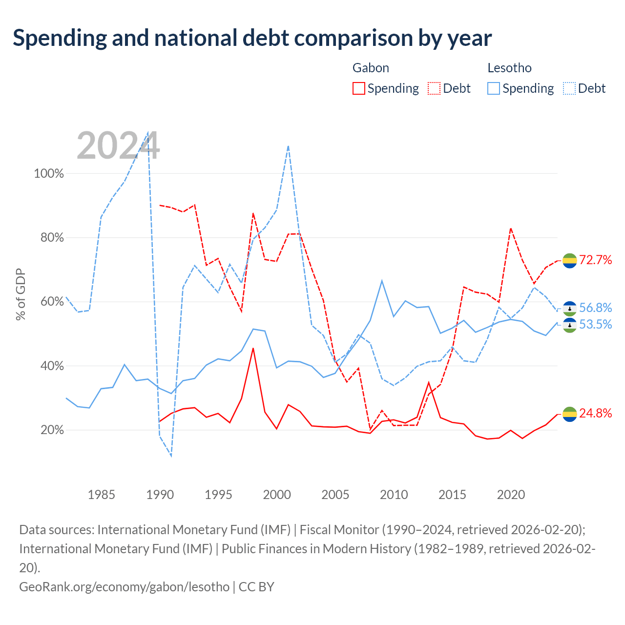 Gabon has $15.2B in government debt (72.7% of GDP), compared to $1.29B (56.8% of GDP) in Lesotho.