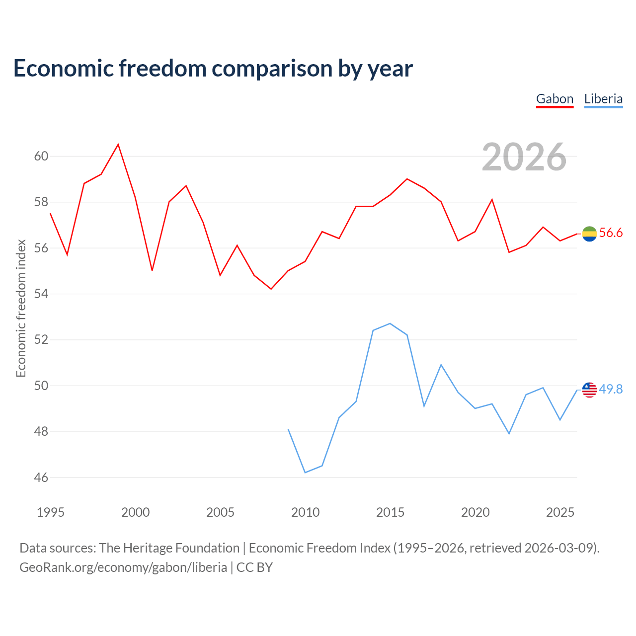 The Economic Freedom Index for Gabon is 56.6, ranking 120/197, compared to 49.8 for Liberia, ranking 163/197. The chart above displays a comparison of annual changes in economic freedom indexes.