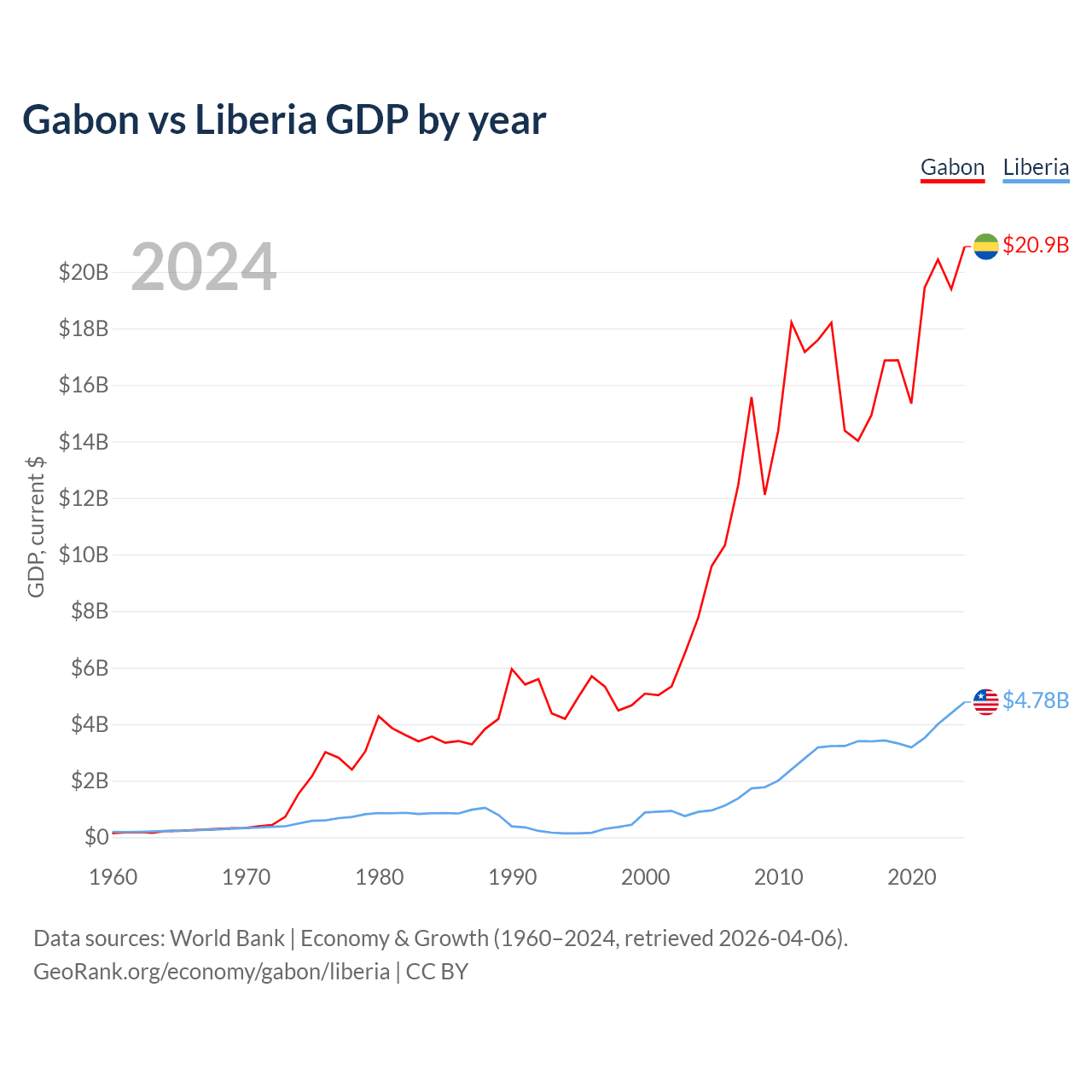 Gabon has a GDP of $20.9B compared to $4.78B for Liberia, ranking 127/197 and 163/197 by economy size, respectively.