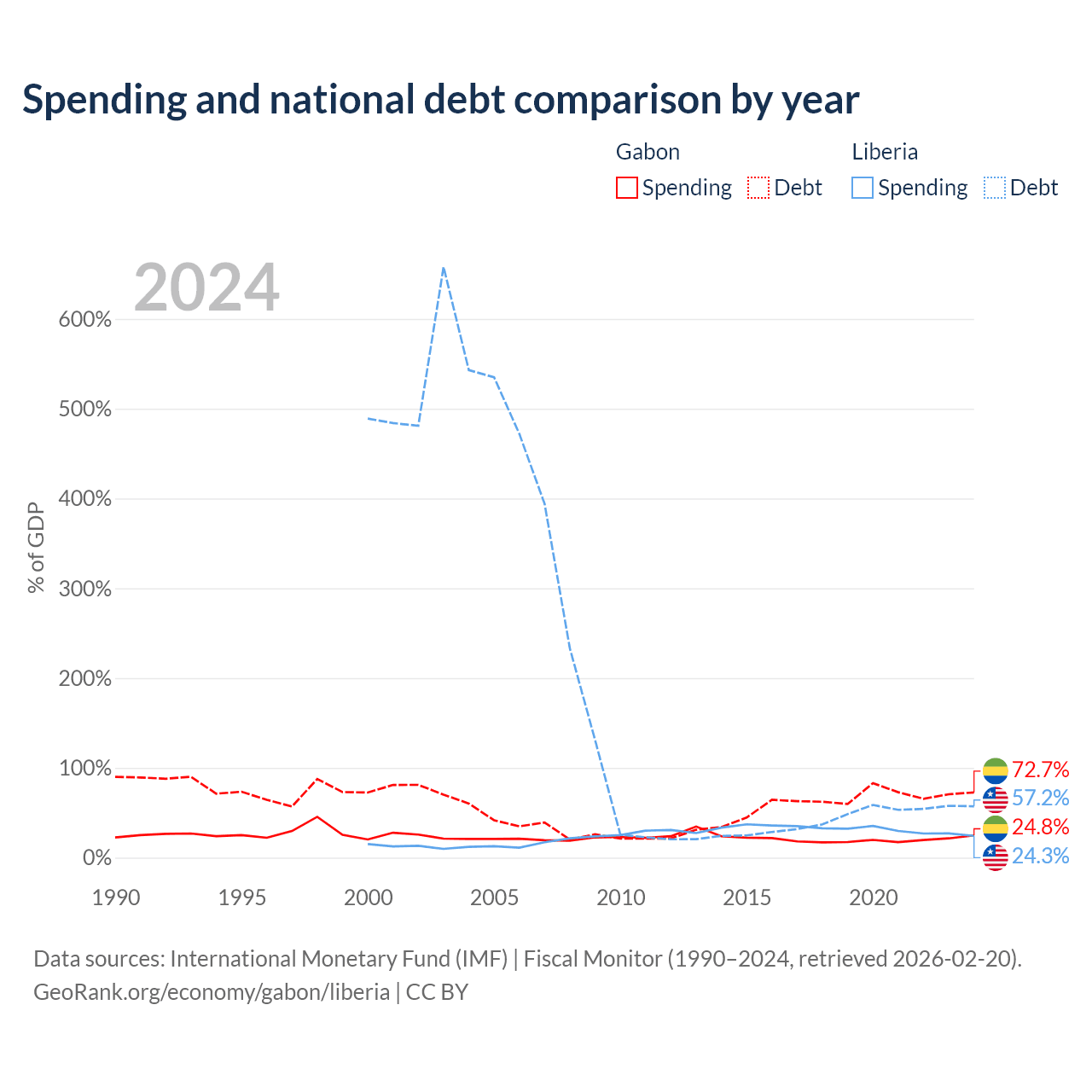 Gabon has $15.2B in government debt (72.7% of GDP), compared to $2.73B (57.2% of GDP) in Liberia.