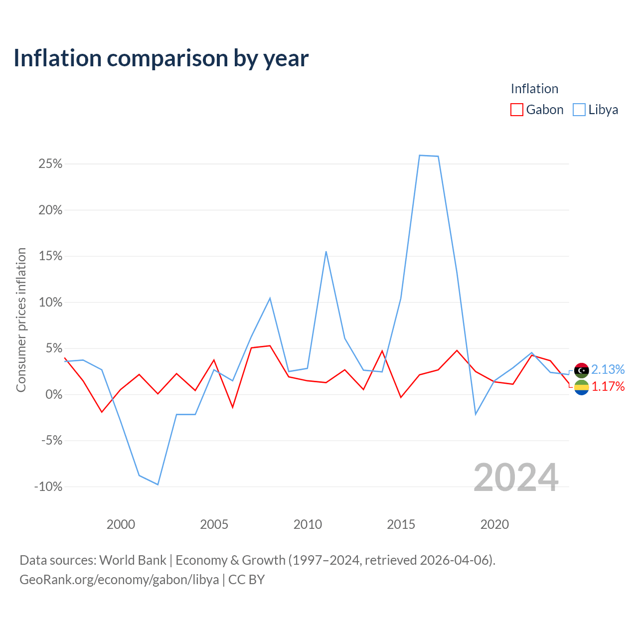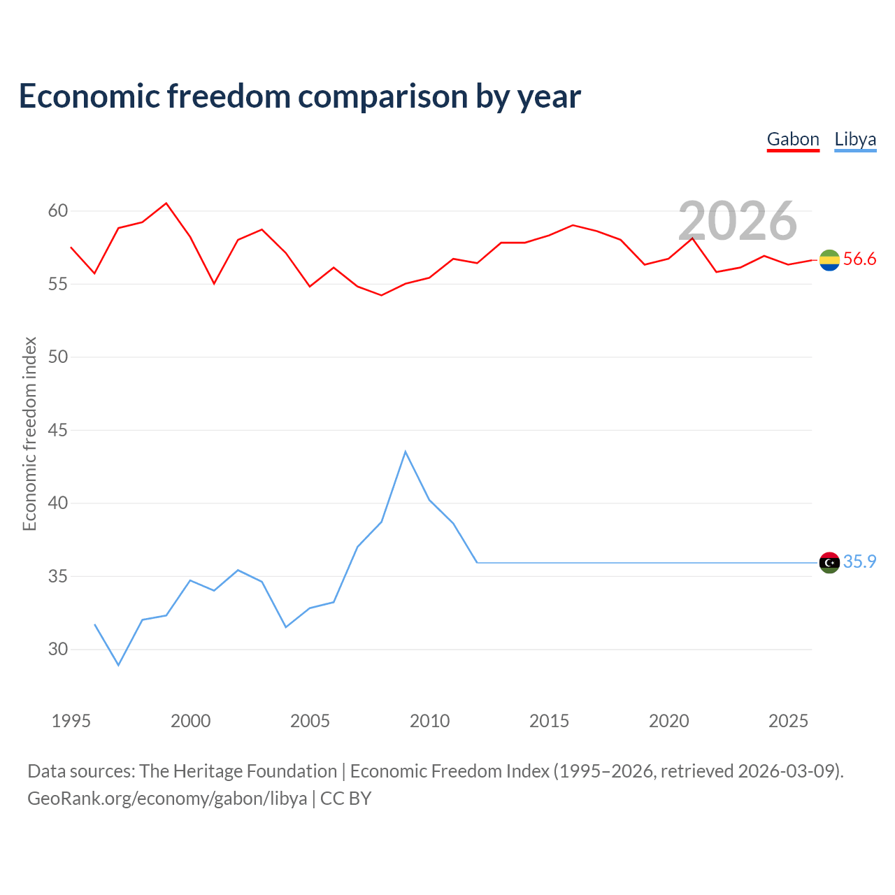 The Economic Freedom Index for Gabon is 56.6, ranking 120/197, compared to 35.9 for Libya, ranking 189/197. The chart above displays a comparison of annual changes in economic freedom indexes.