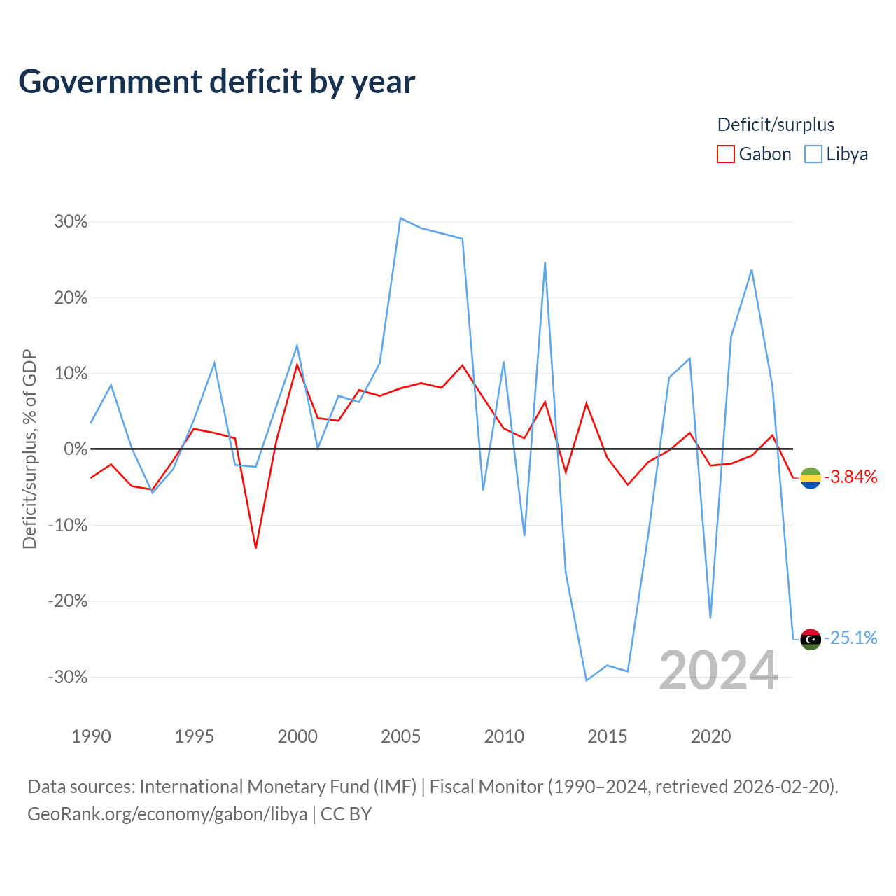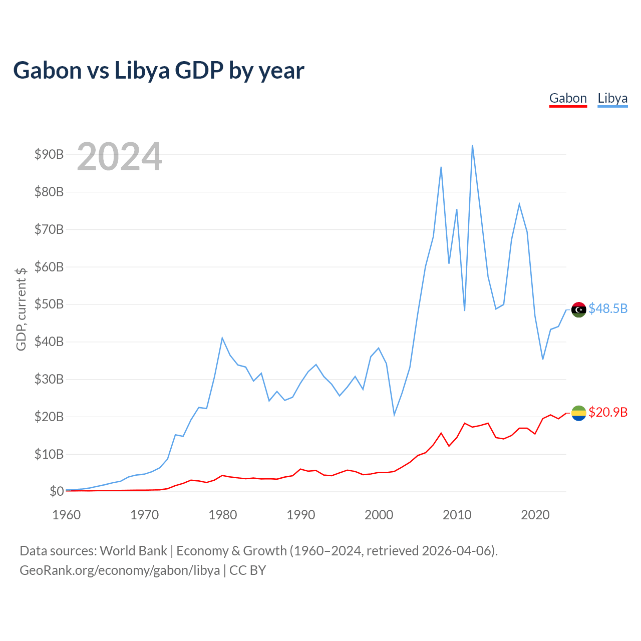 Gabon has a GDP of $20.9B compared to $48.5B for Libya, ranking 127/197 and 95/197 by economy size, respectively.