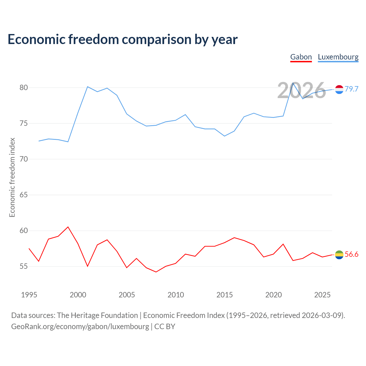 The Economic Freedom Index for Gabon is 56.6, ranking 120/197, compared to 79.7 for Luxembourg, ranking 7/197. The chart above displays a comparison of annual changes in economic freedom indexes.