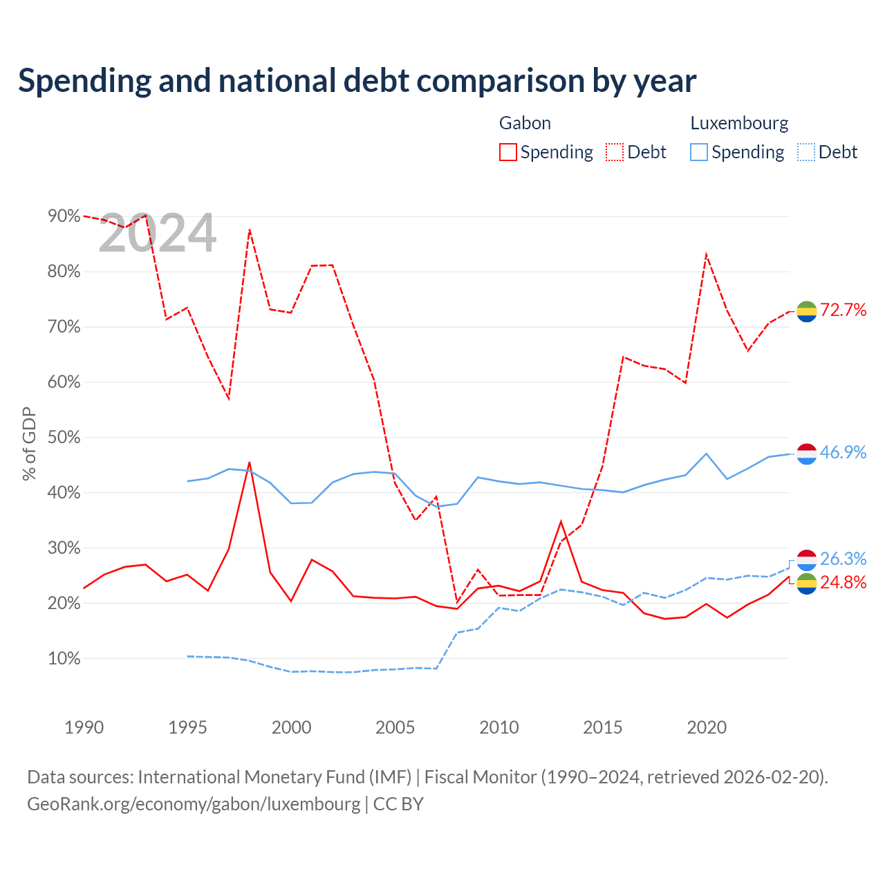 Gabon has $15.2B in government debt (72.7% of GDP), compared to $24.5B (26.3% of GDP) in Luxembourg.