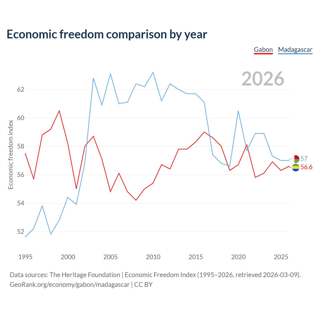 The Economic Freedom Index for Gabon is 56.6, ranking 120/197, compared to 57 for Madagascar, ranking 119/197. The chart above displays a comparison of annual changes in economic freedom indexes.