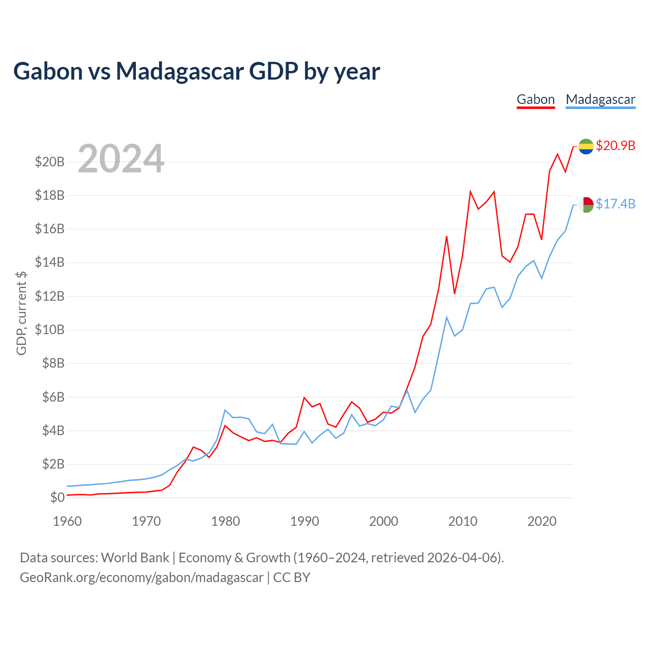 Gabon has a GDP of $20.9B compared to $17.4B for Madagascar, ranking 127/197 and 136/197 by economy size, respectively.