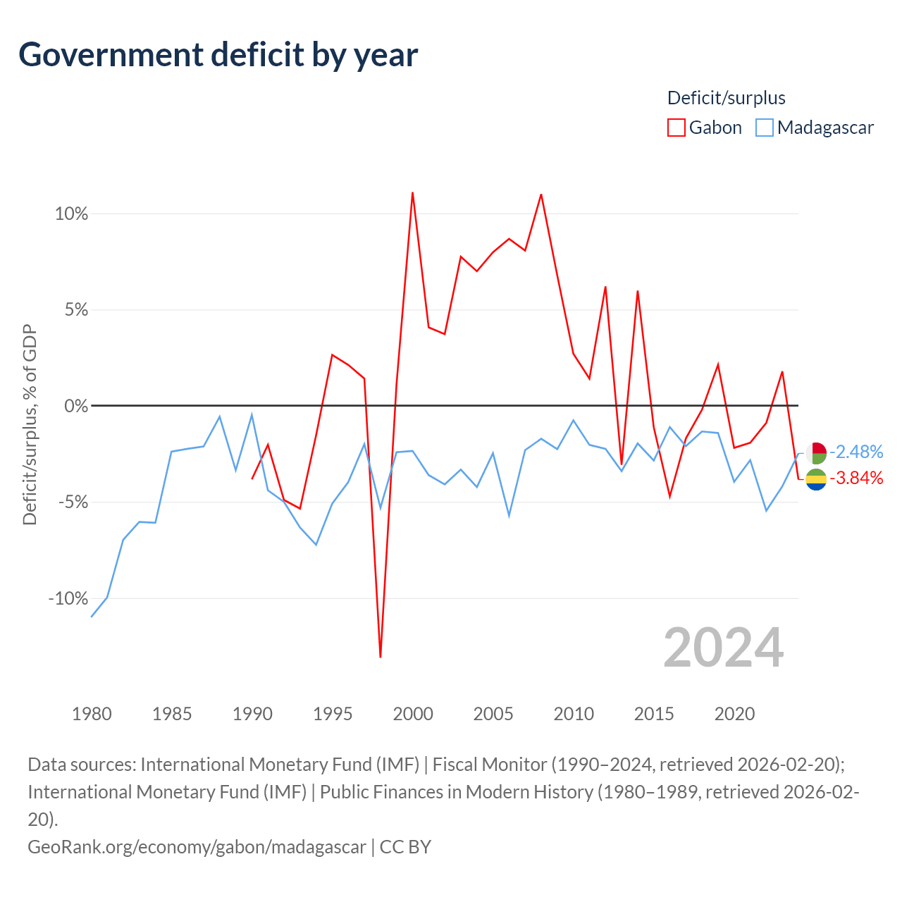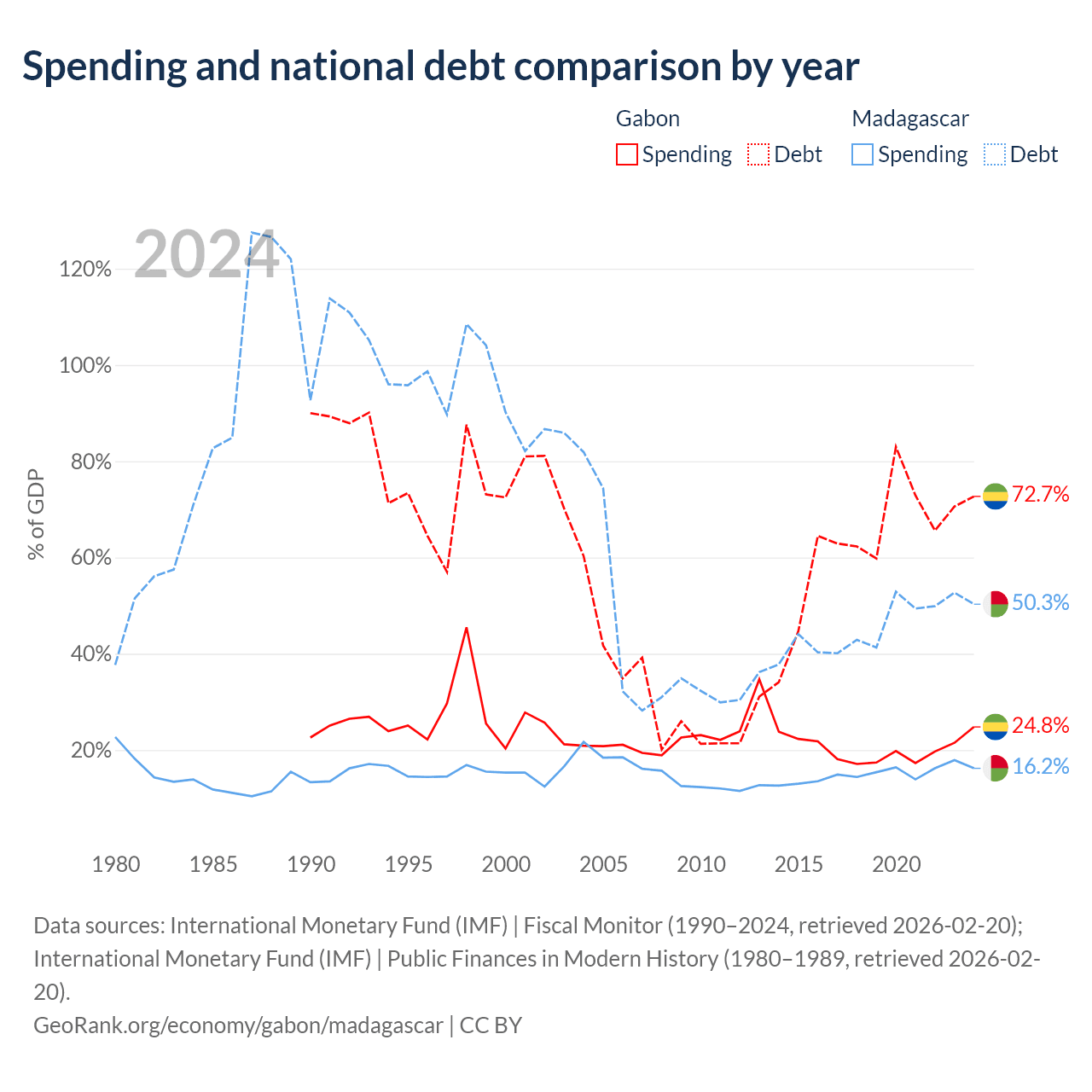 Gabon has $15.2B in government debt (72.7% of GDP), compared to $8.77B (50.3% of GDP) in Madagascar.