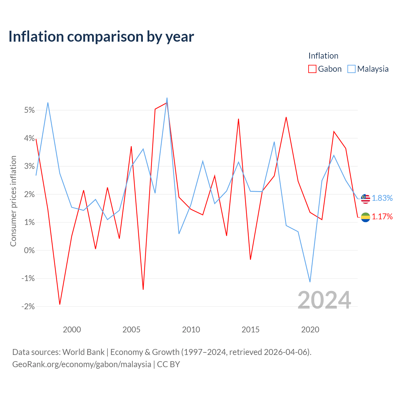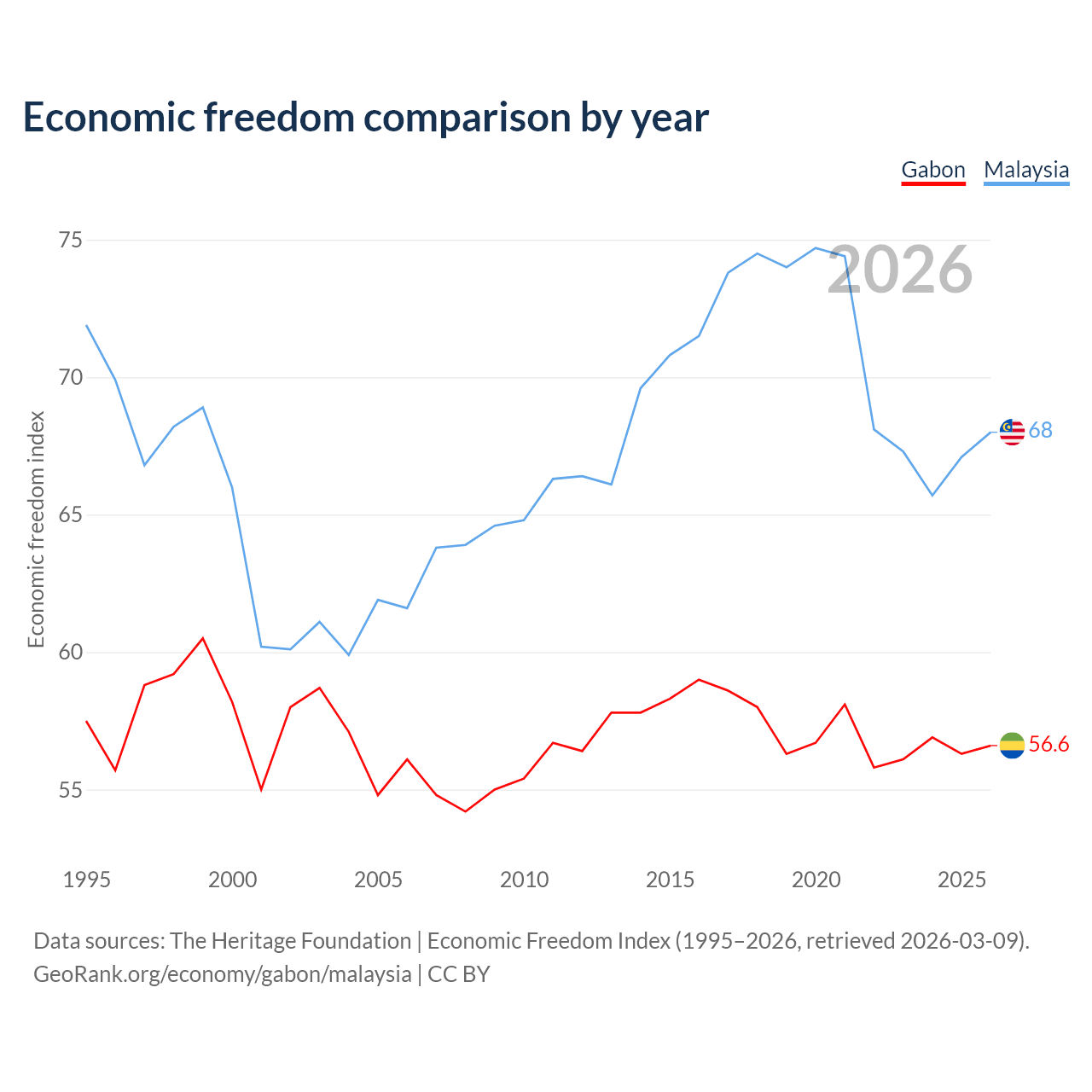 The Economic Freedom Index for Gabon is 56.6, ranking 120/197, compared to 68 for Malaysia, ranking 51/197. The chart above displays a comparison of annual changes in economic freedom indexes.