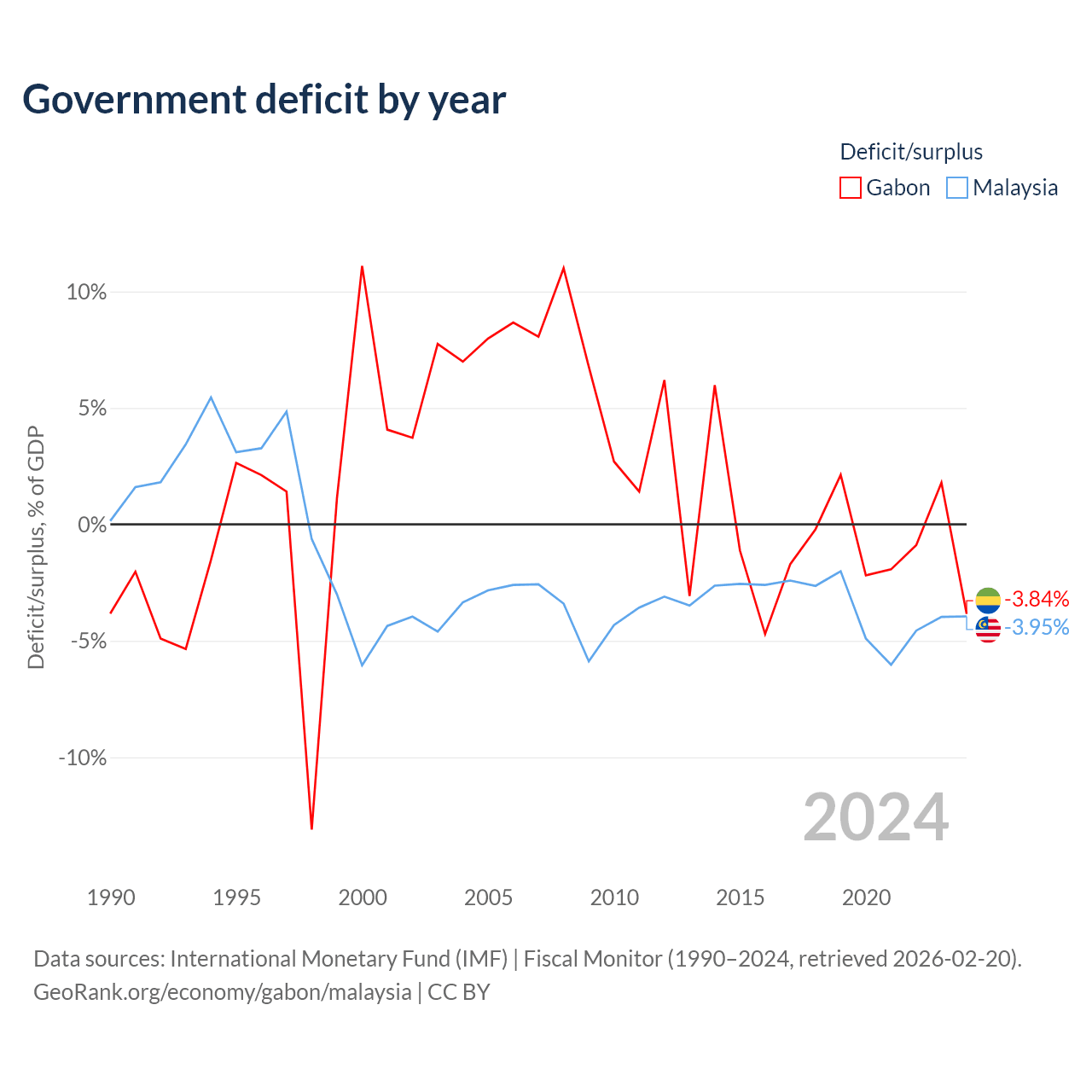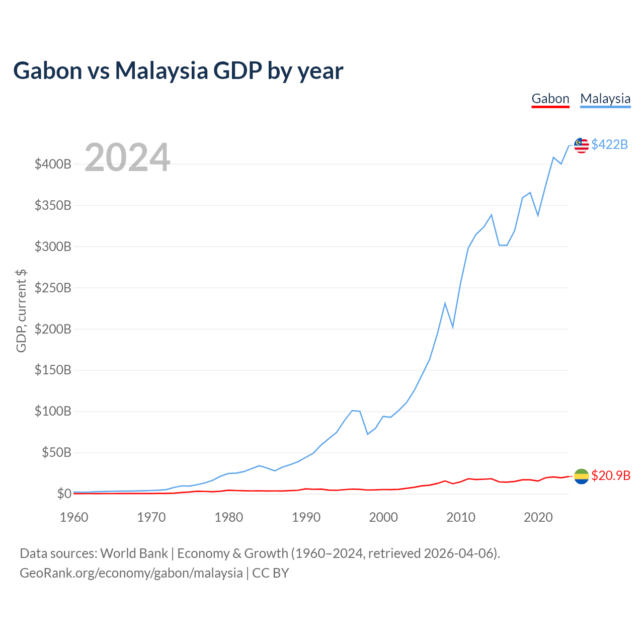 Gabon has a GDP of $20.9B compared to $422B for Malaysia, ranking 127/197 and 38/197 by economy size, respectively.