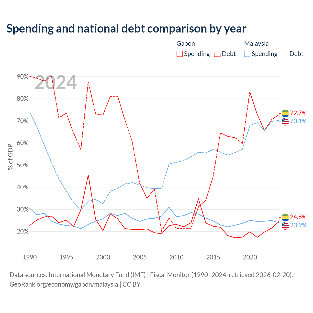 Gabon has $15.2B in government debt (72.7% of GDP), compared to $296B (70.1% of GDP) in Malaysia.
