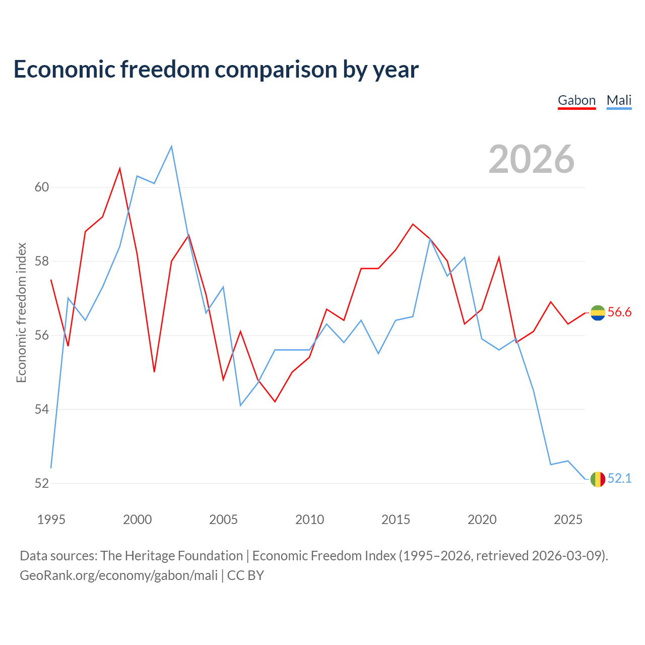 The Economic Freedom Index for Gabon is 56.6, ranking 120/197, compared to 52.1 for Mali, ranking 150/197. The chart above displays a comparison of annual changes in economic freedom indexes.