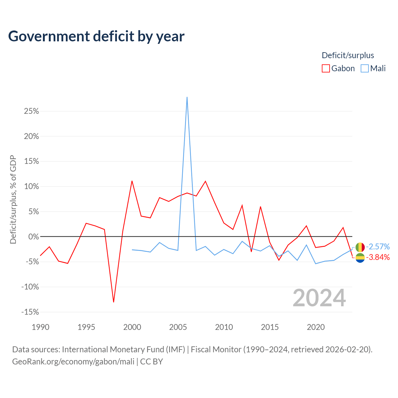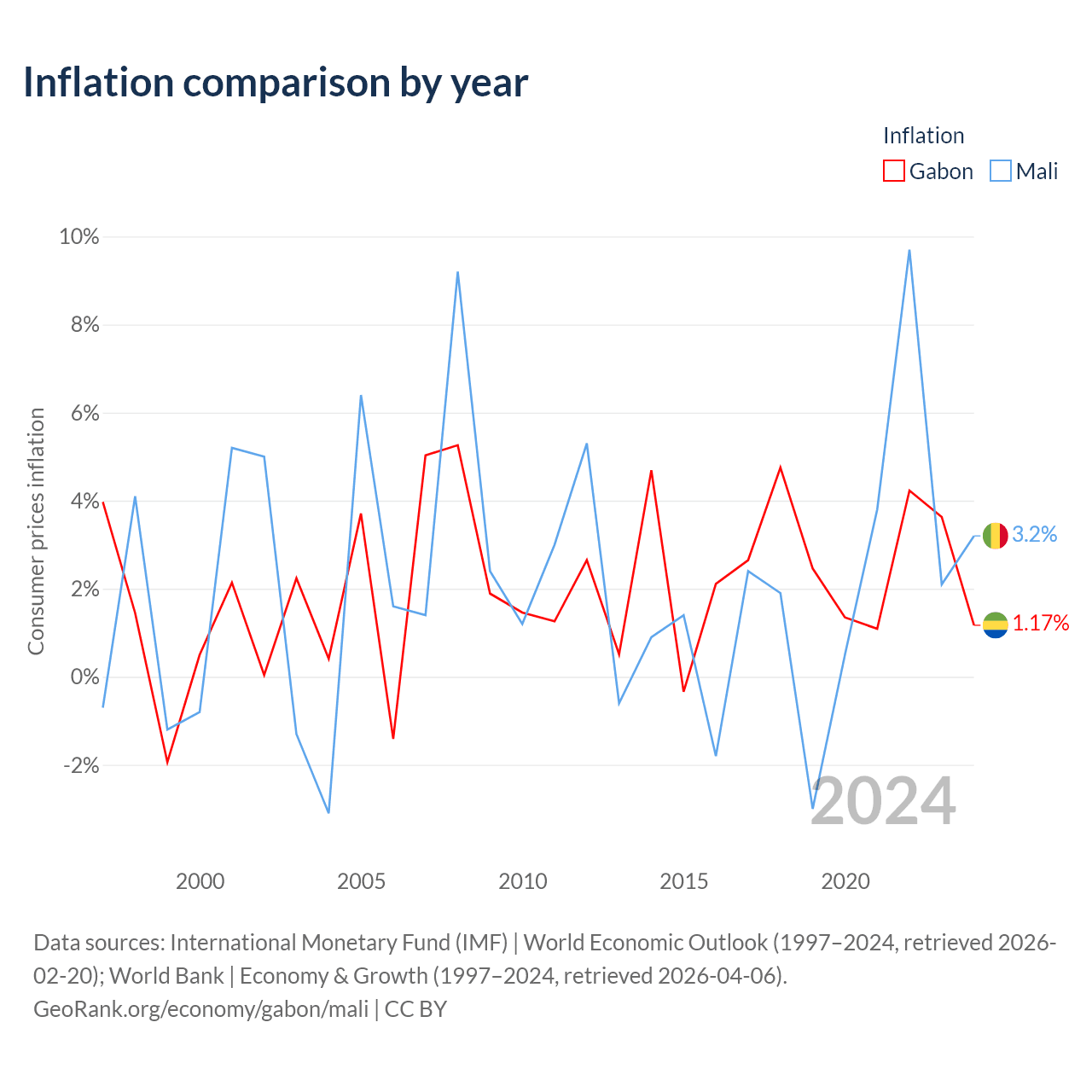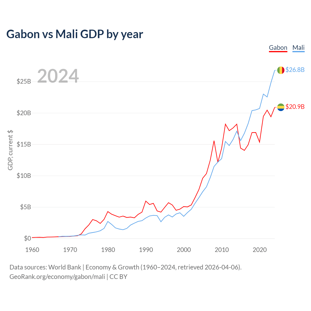 Gabon has a GDP of $20.9B compared to $26.8B for Mali, ranking 127/197 and 113/197 by economy size, respectively.