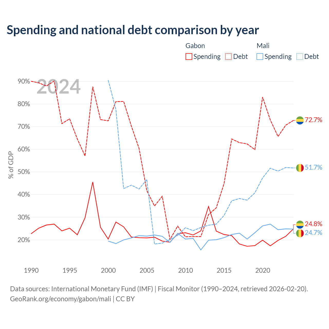 Gabon has $15.2B in government debt (72.7% of GDP), compared to $13.9B (51.7% of GDP) in Mali.