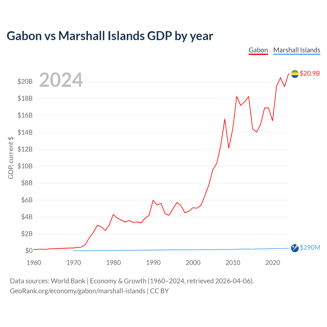 Gabon has a GDP of $20.9B compared to $290M for the Marshall Islands, ranking 127/197 and 193/197 by economy size, respectively.