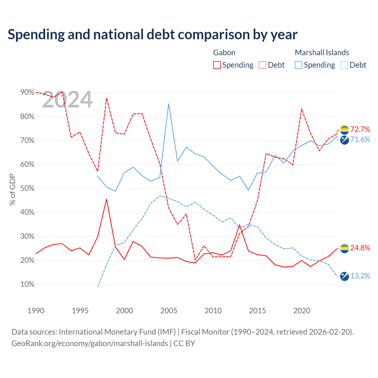 Gabon has $15.2B in government debt (72.7% of GDP), compared to $38.4M (13.2% of GDP) in the Marshall Islands.