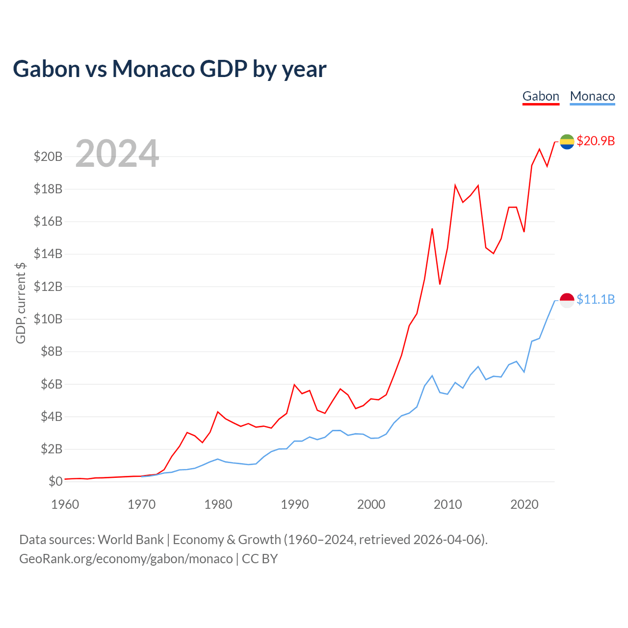 Gabon has a GDP of $20.9B compared to $11.1B for Monaco, ranking 127/197 and 152/197 by economy size, respectively.