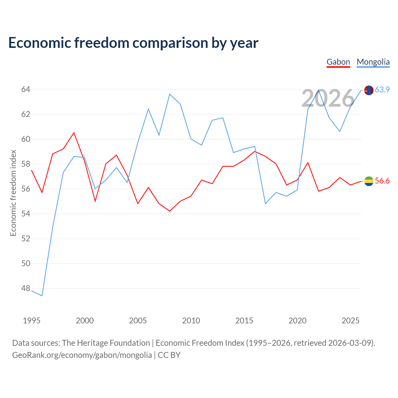 The Economic Freedom Index for Gabon is 56.6, ranking 120/197, compared to 63.9 for Mongolia, ranking 76/197. The chart above displays a comparison of annual changes in economic freedom indexes.