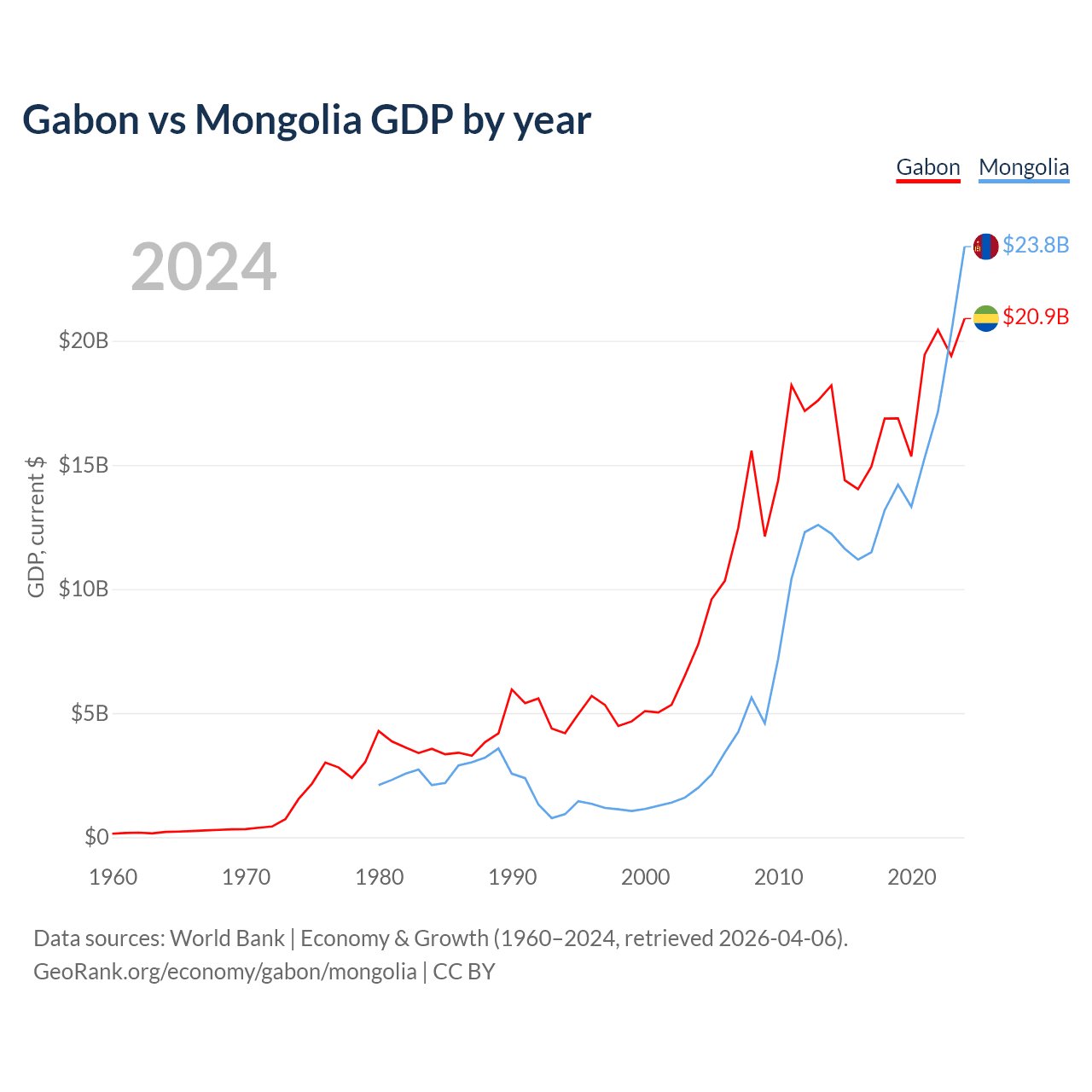 Gabon has a GDP of $20.9B compared to $23.8B for Mongolia, ranking 127/197 and 121/197 by economy size, respectively.