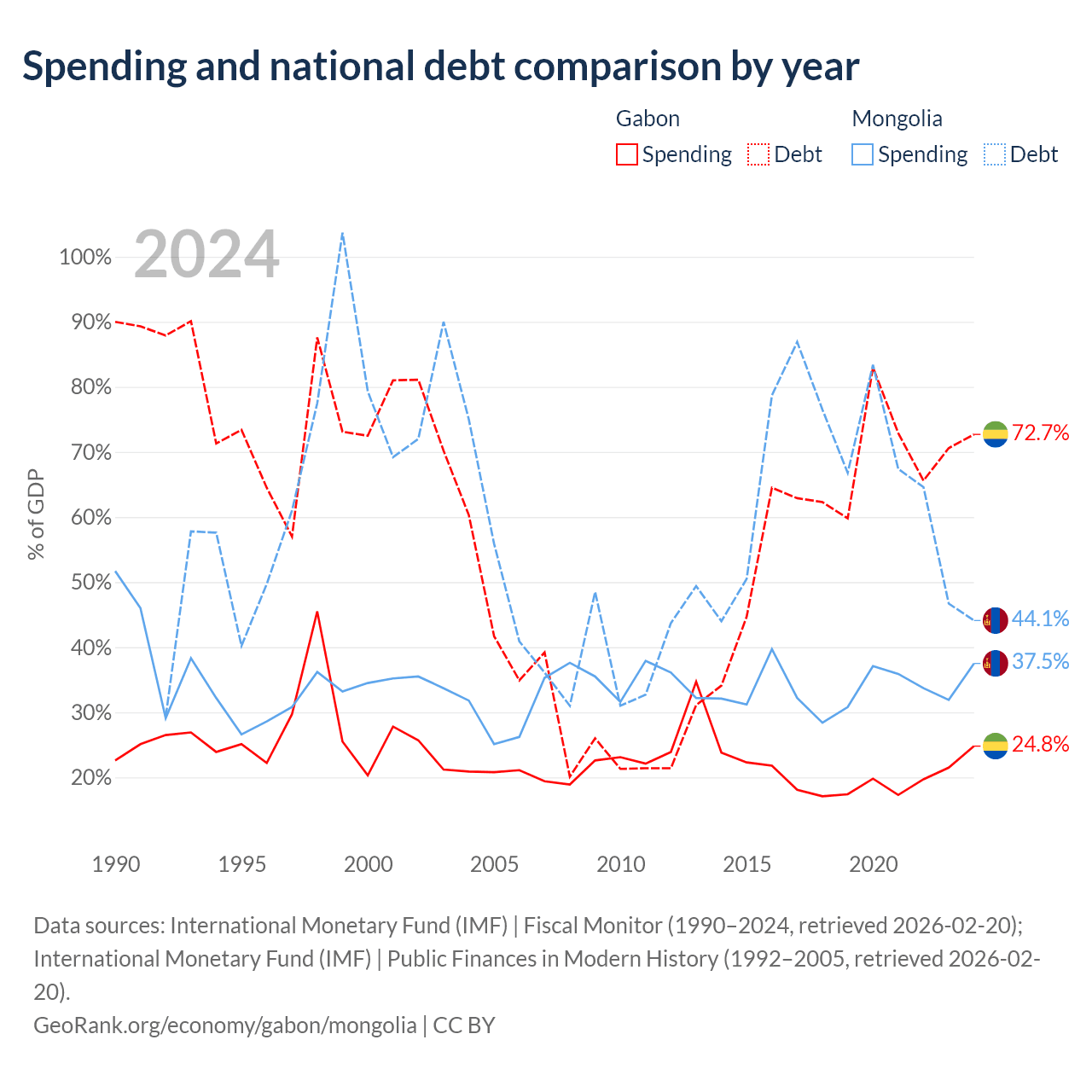 Gabon has $15.2B in government debt (72.7% of GDP), compared to $10.5B (44.1% of GDP) in Mongolia.