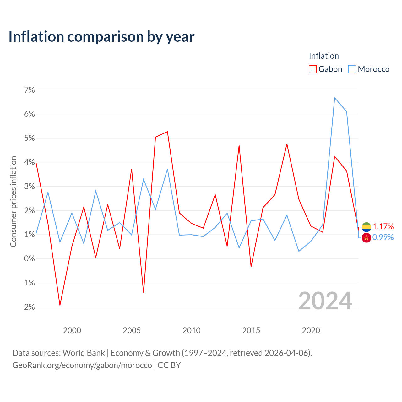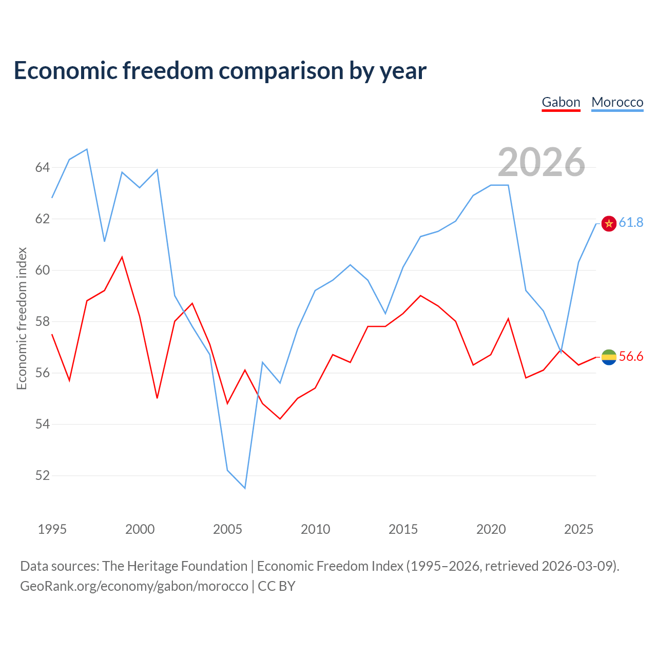 The Economic Freedom Index for Gabon is 56.6, ranking 120/197, compared to 61.8 for Morocco, ranking 91/197. The chart above displays a comparison of annual changes in economic freedom indexes.