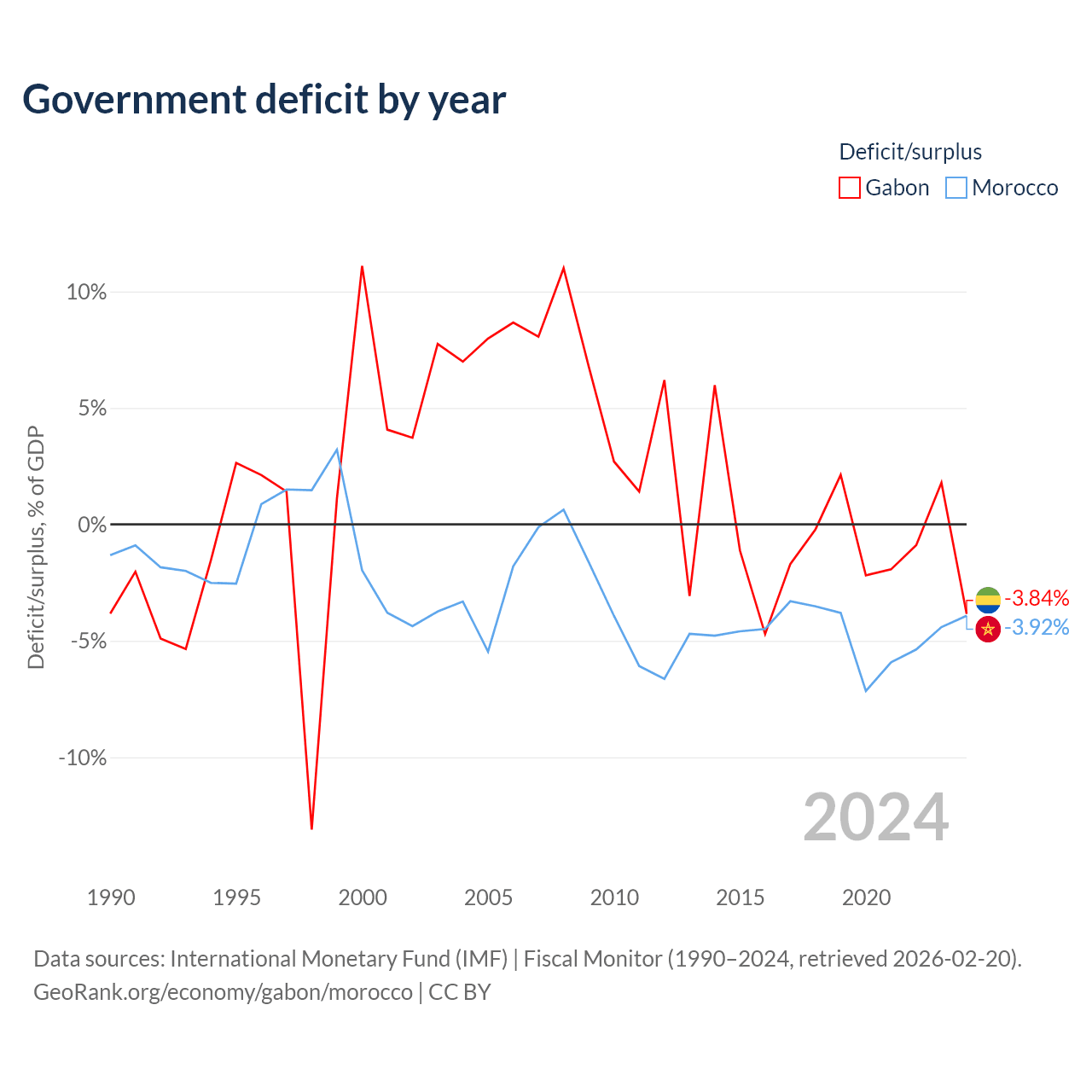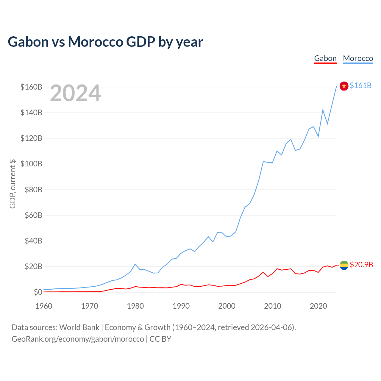 Gabon has a GDP of $20.9B compared to $161B for Morocco, ranking 127/197 and 58/197 by economy size, respectively.