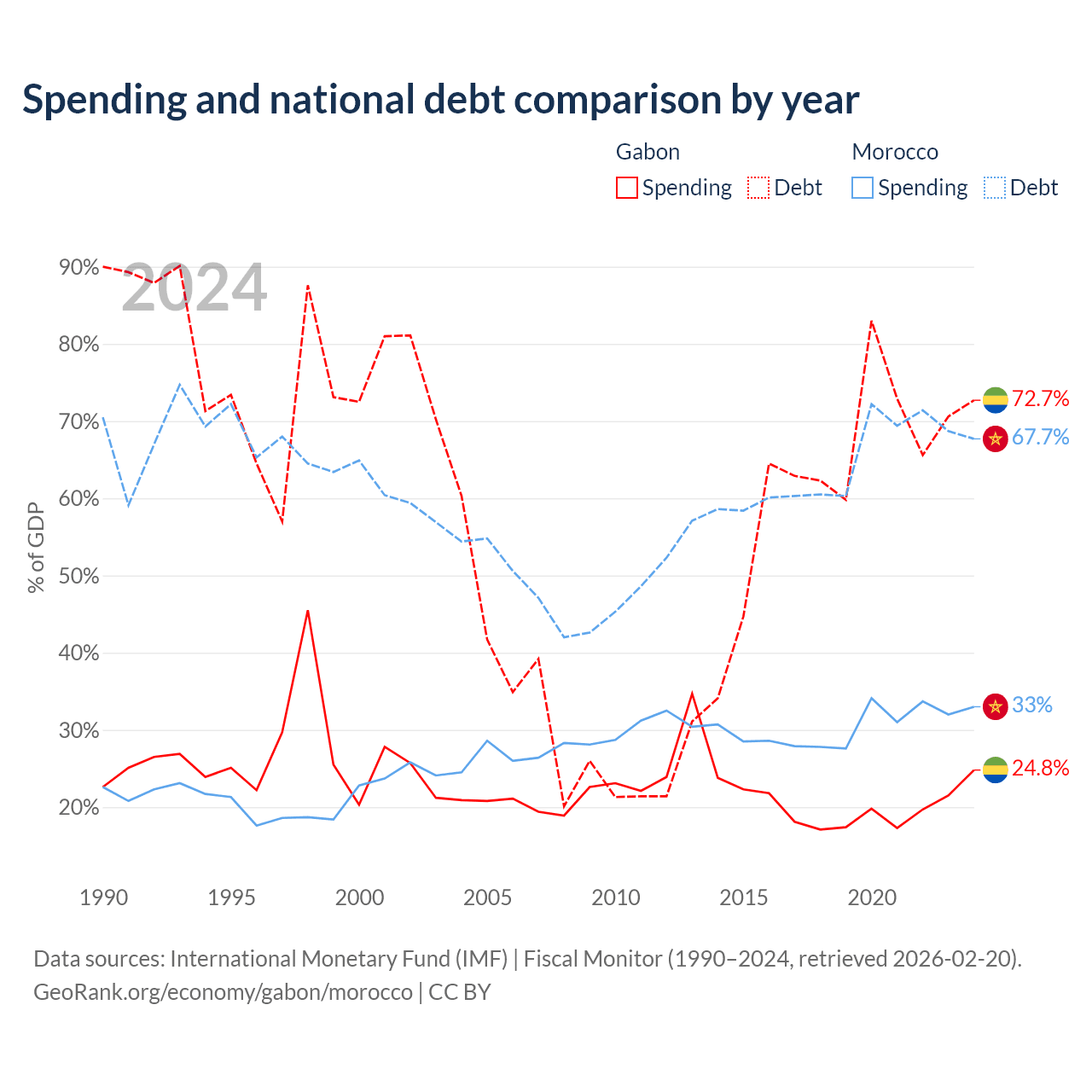 Gabon has $15.2B in government debt (72.7% of GDP), compared to $109B (67.7% of GDP) in Morocco.