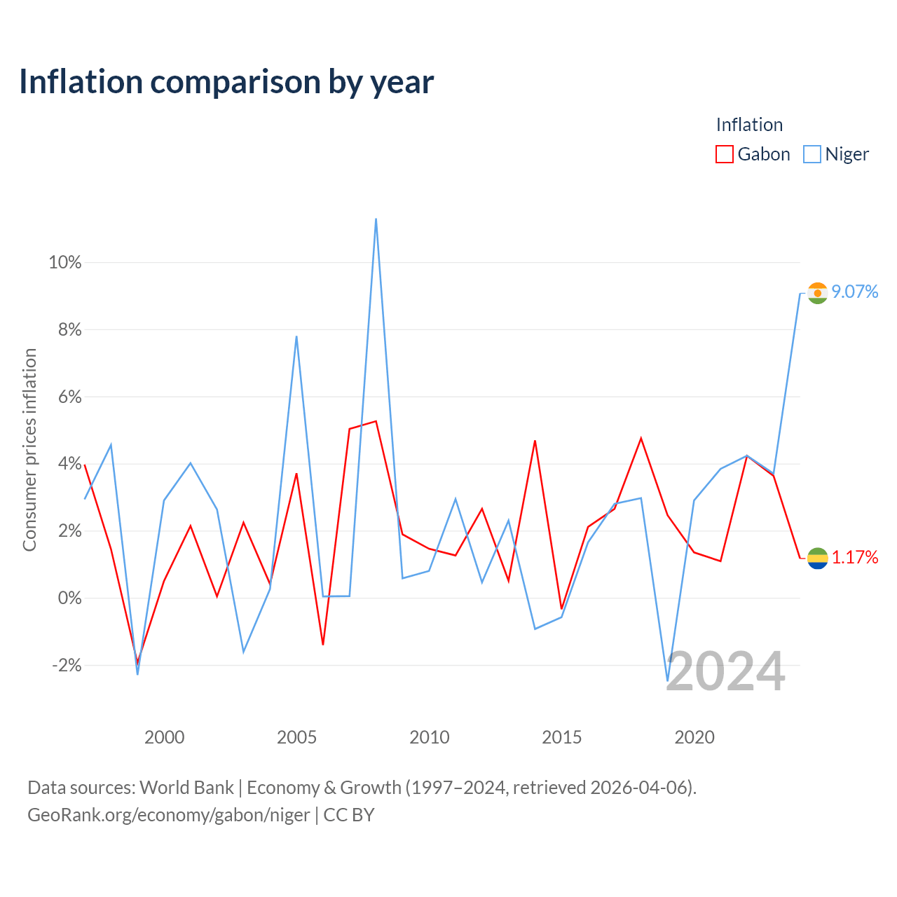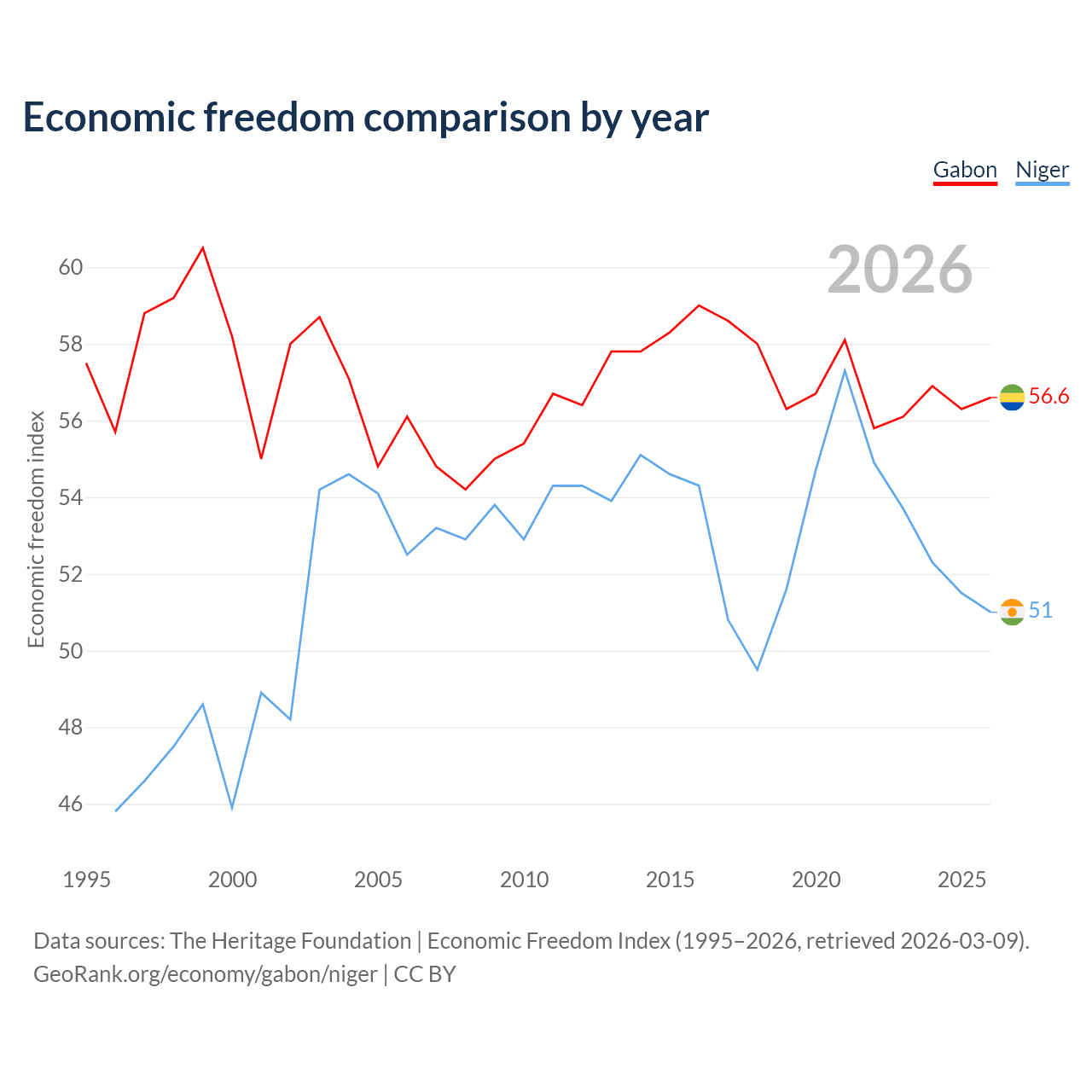 The Economic Freedom Index for Gabon is 56.6, ranking 120/197, compared to 51 for Niger, ranking 156/197. The chart above displays a comparison of annual changes in economic freedom indexes.