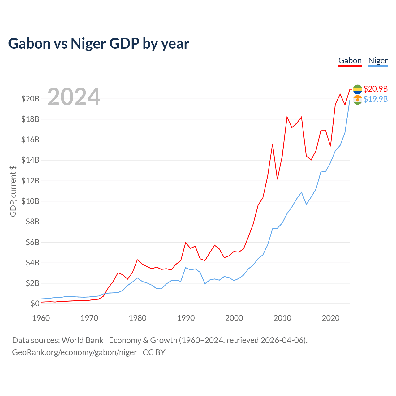 Gabon has a GDP of $20.9B compared to $19.9B for Niger, ranking 127/197 and 130/197 by economy size, respectively.