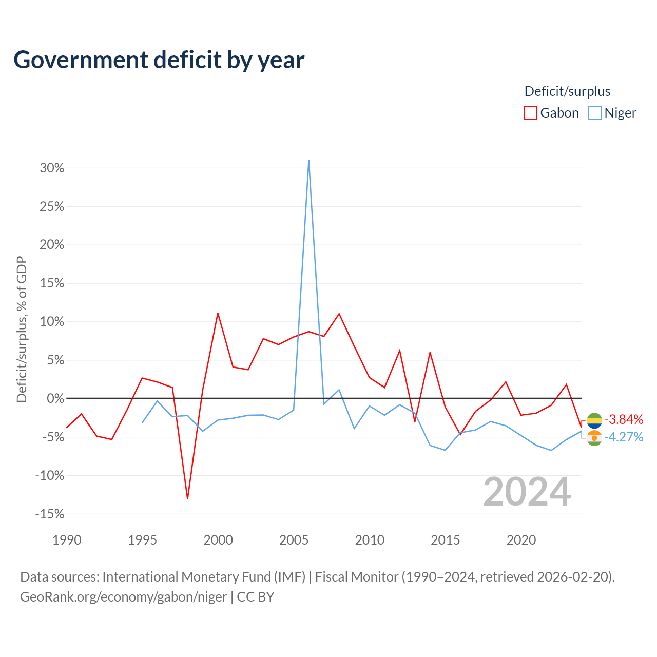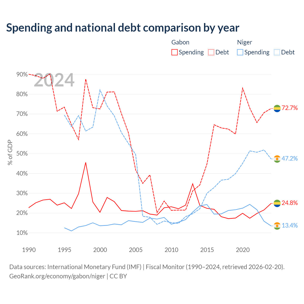 Gabon has $15.2B in government debt (72.7% of GDP), compared to $9.39B (47.2% of GDP) in Niger.