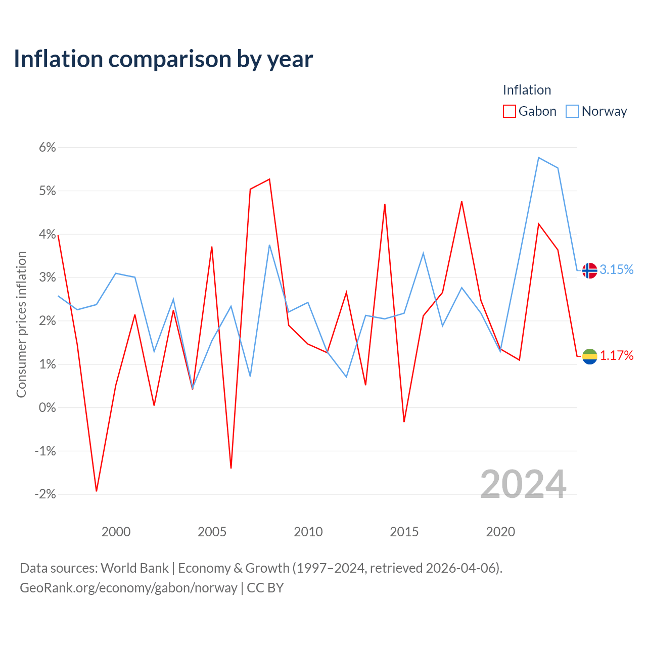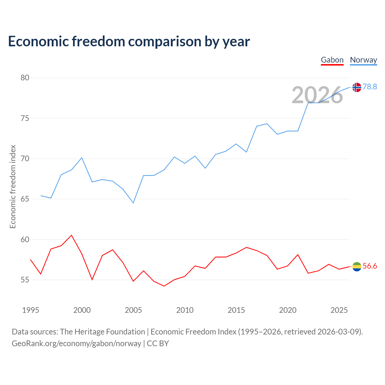 The Economic Freedom Index for Gabon is 56.6, ranking 120/197, compared to 78.8 for Norway, ranking 9/197. The chart above displays a comparison of annual changes in economic freedom indexes.