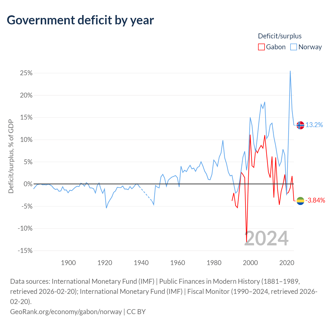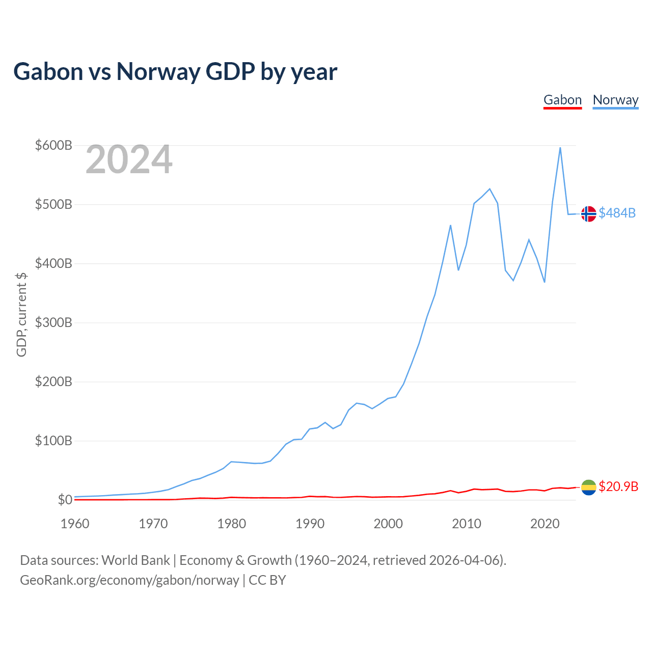 Gabon has a GDP of $20.9B compared to $484B for Norway, ranking 127/197 and 32/197 by economy size, respectively.