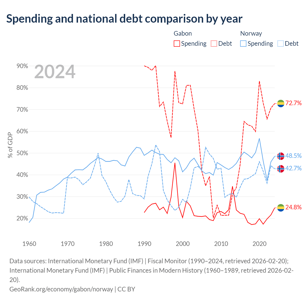 Gabon has $15.2B in government debt (72.7% of GDP), compared to $207B (42.7% of GDP) in Norway.