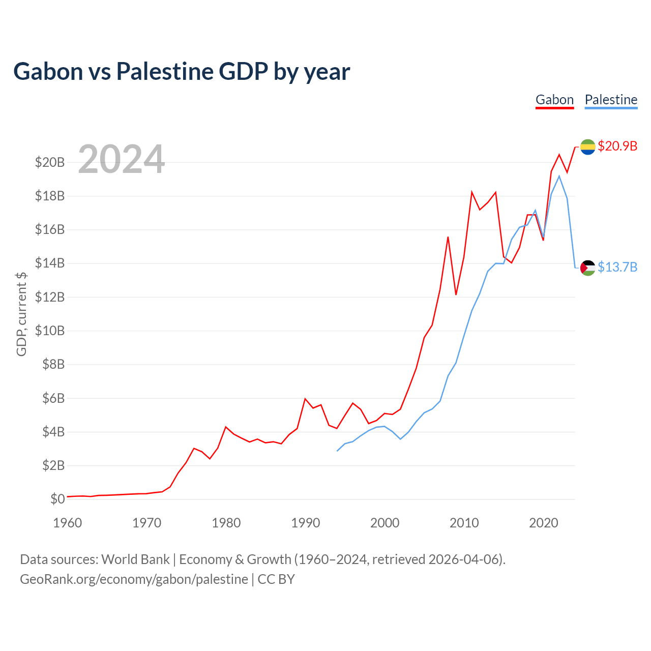 Gabon has a GDP of $20.9B compared to $13.7B for Palestine, ranking 127/197 and 146/197 by economy size, respectively.