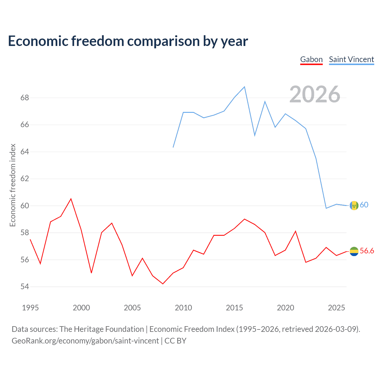 The Economic Freedom Index for Gabon is 56.6, ranking 120/197, compared to 60 for Saint Vincent, ranking 98/197. The chart above displays a comparison of annual changes in economic freedom indexes.