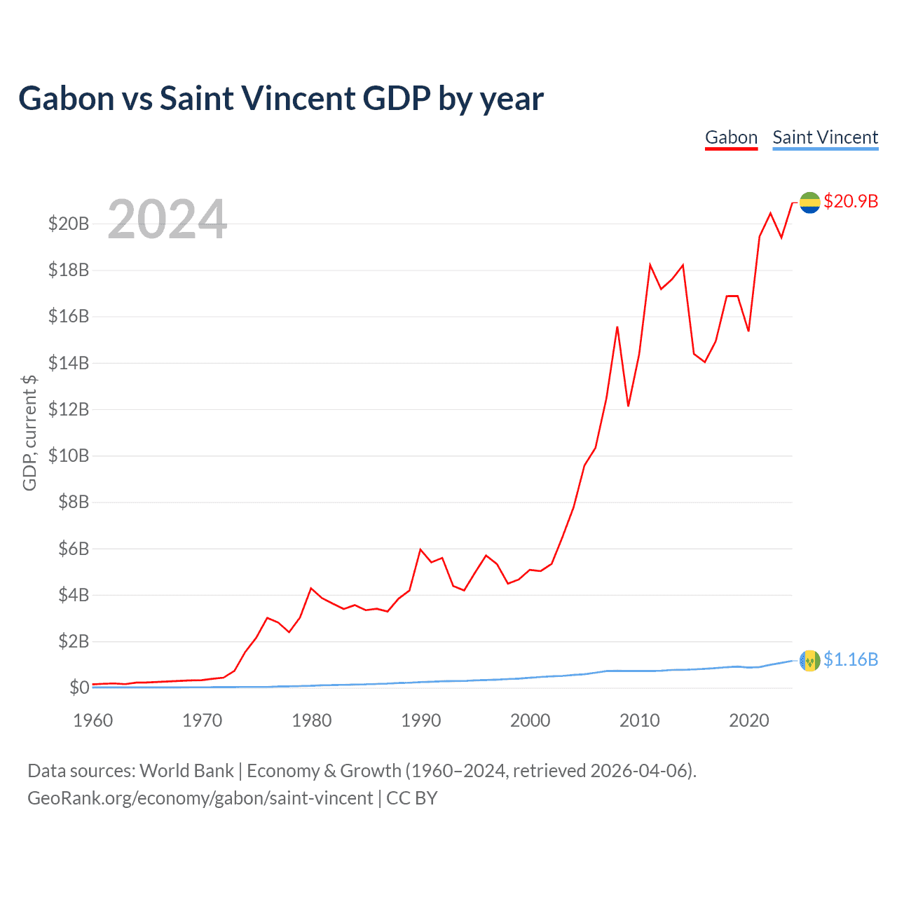 Gabon has a GDP of $20.9B compared to $1.16B for Saint Vincent, ranking 127/197 and 186/197 by economy size, respectively.