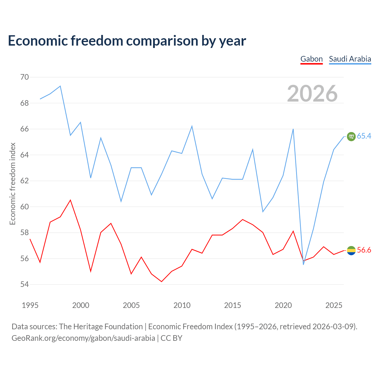 The Economic Freedom Index for Gabon is 56.6, ranking 120/197, compared to 65.4 for Saudi Arabia, ranking 65/197. The chart above displays a comparison of annual changes in economic freedom indexes.