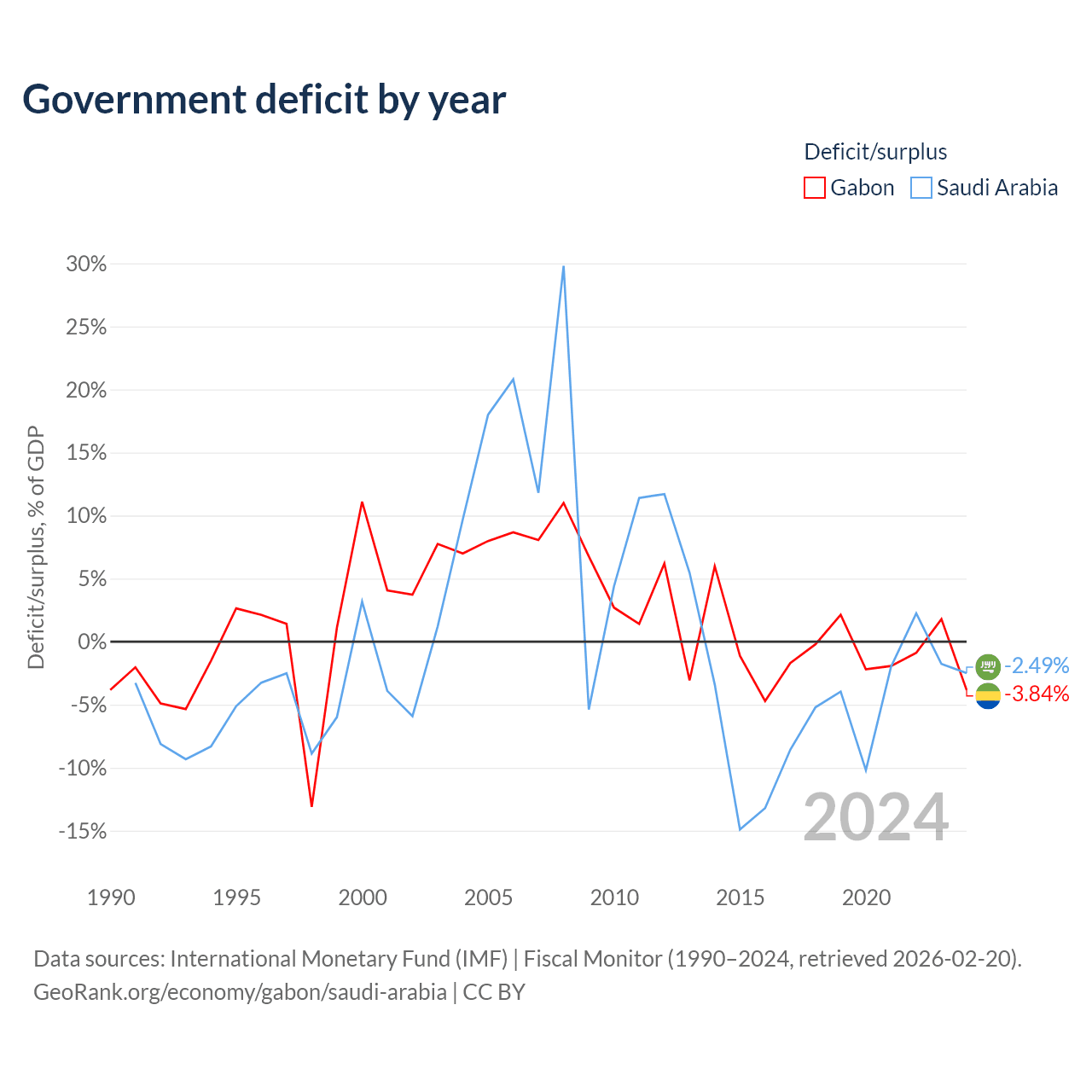 Gabon has a GDP of $20.9B compared to $1.24T for Saudi Arabia, ranking 127/197 and 18/197 by economy size, respectively.
