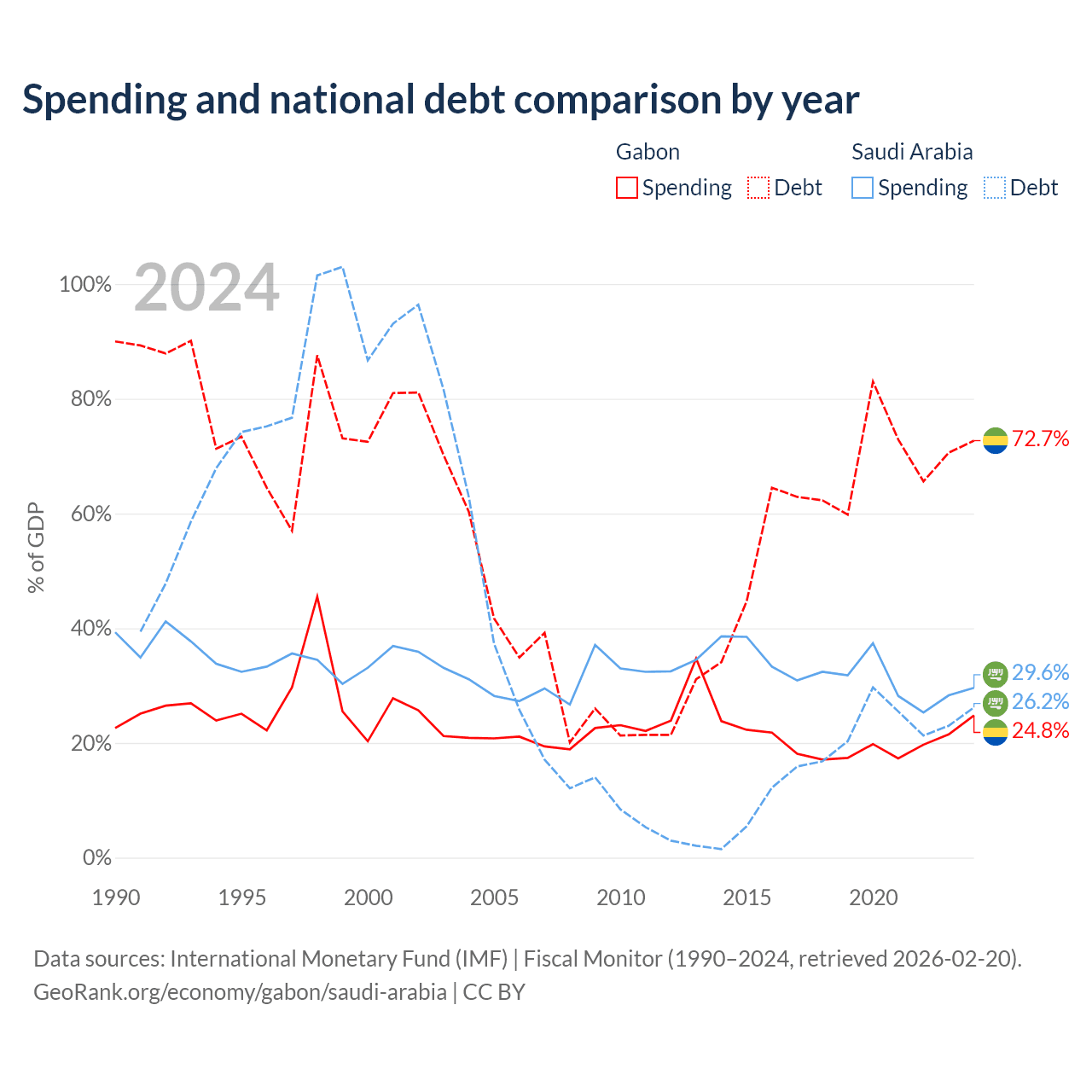 Gabon has $15.2B in government debt (72.7% of GDP), compared to $324B (26.2% of GDP) in Saudi Arabia.