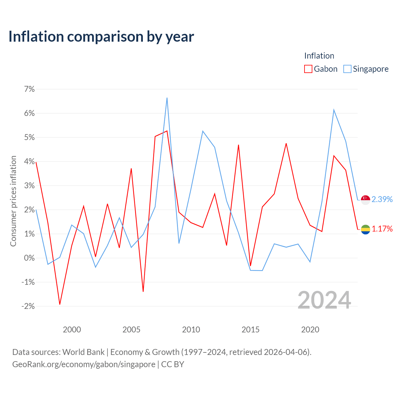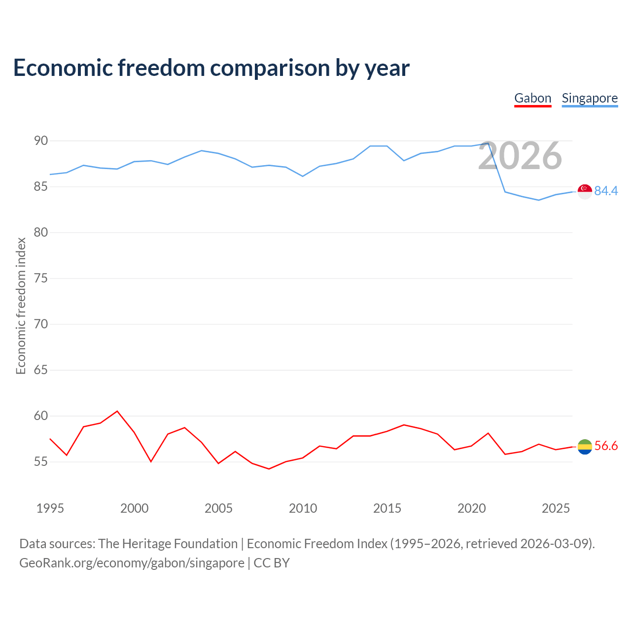 The Economic Freedom Index for Gabon is 56.6, ranking 120/197, compared to 84.4 for Singapore, ranking 1/197. The chart above displays a comparison of annual changes in economic freedom indexes.