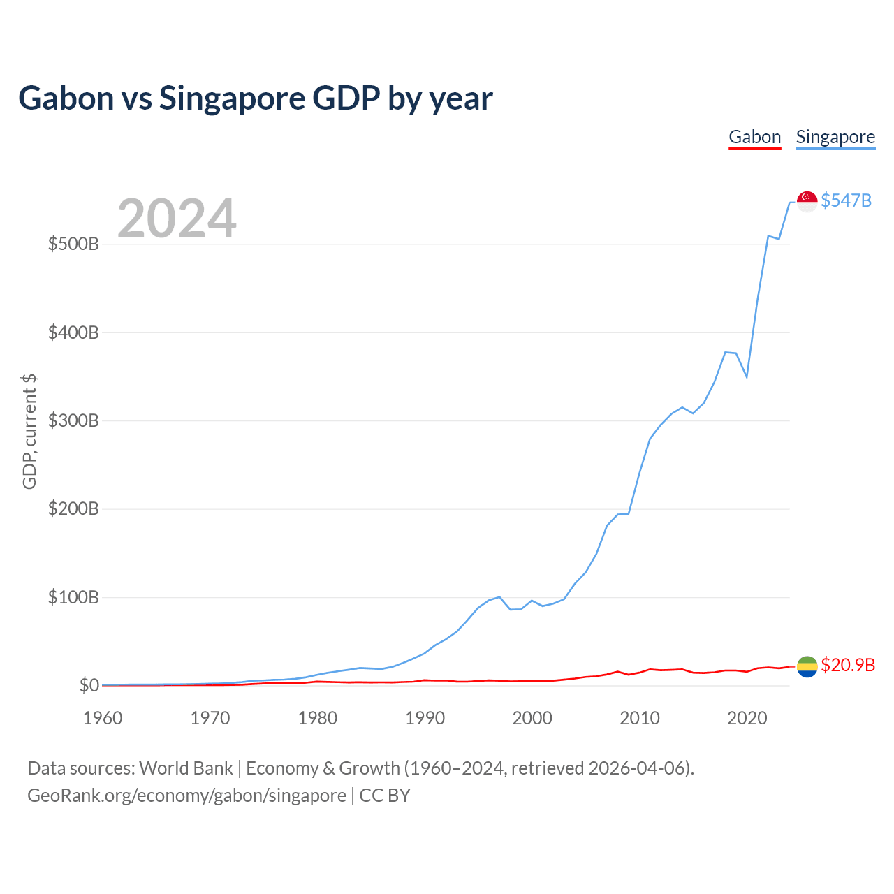 Gabon has a GDP of $20.9B compared to $547B for Singapore, ranking 127/197 and 28/197 by economy size, respectively.