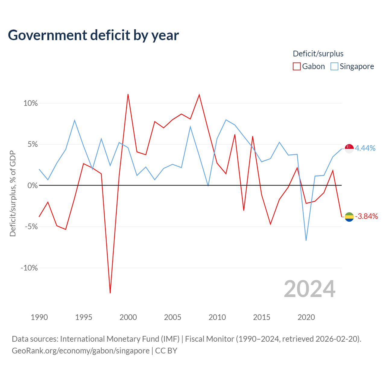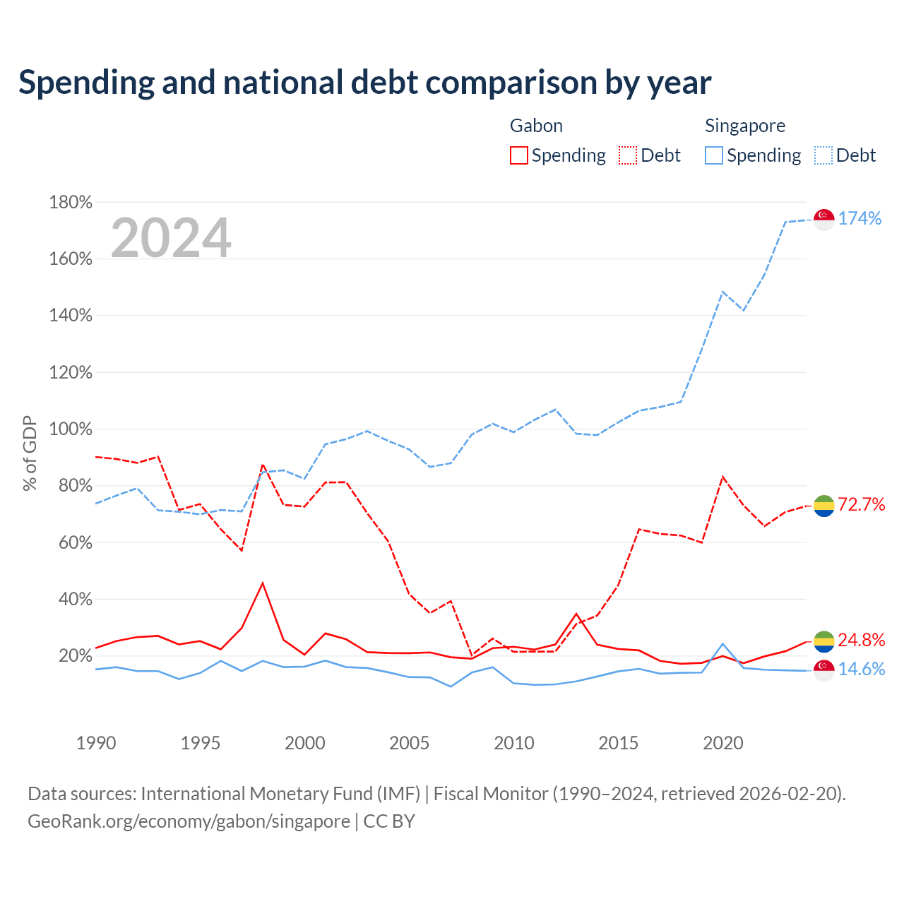 Gabon has $15.2B in government debt (72.7% of GDP), compared to $950B (173.5% of GDP) in Singapore.