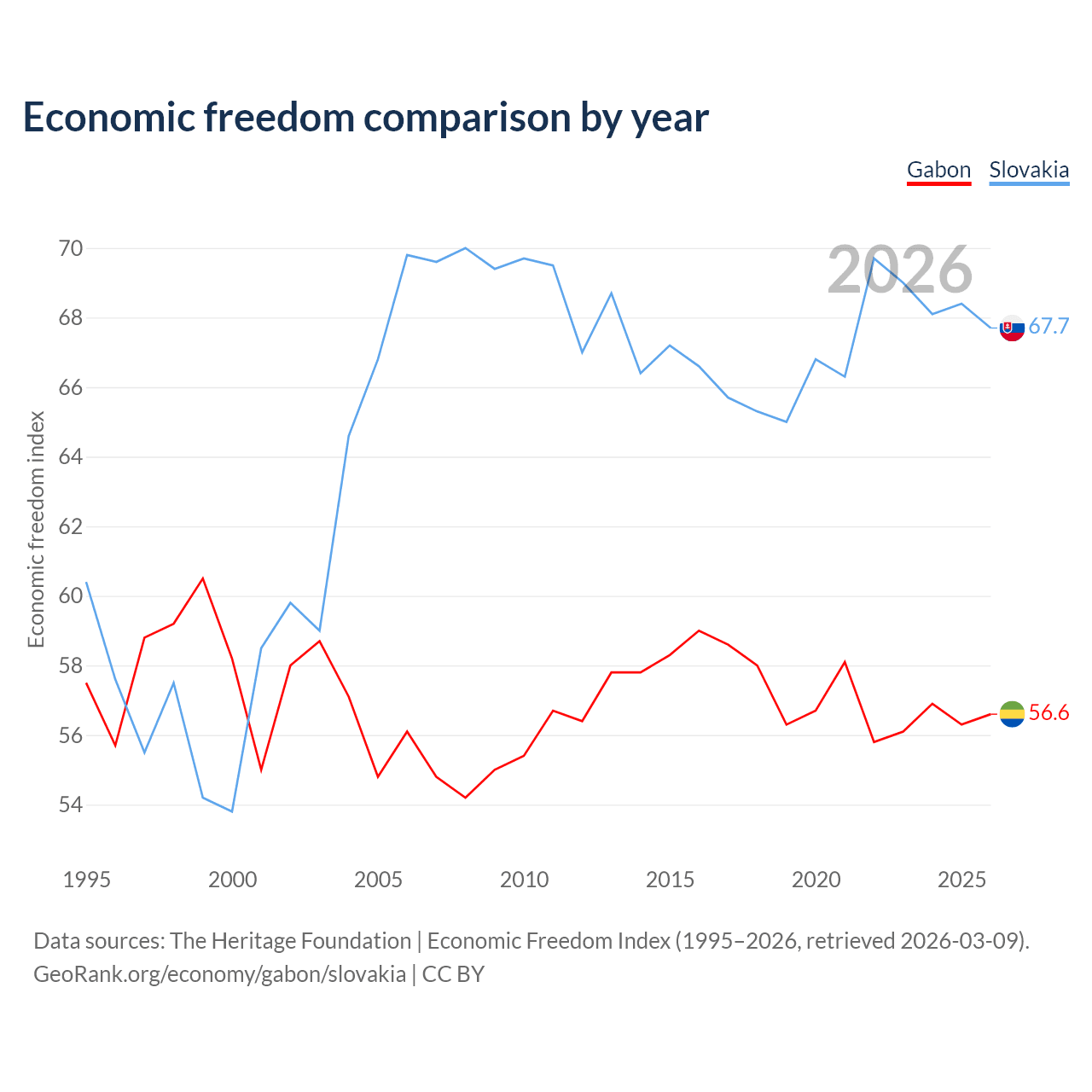 The Economic Freedom Index for Gabon is 56.6, ranking 120/197, compared to 67.7 for Slovakia, ranking 54/197. The chart above displays a comparison of annual changes in economic freedom indexes.