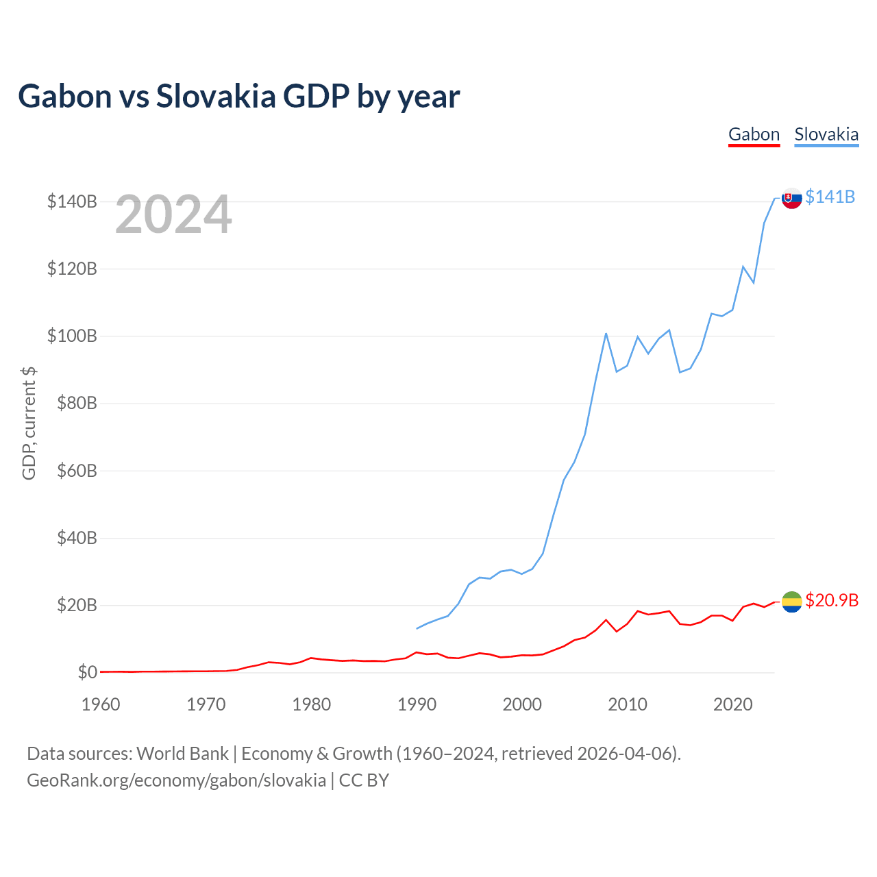Gabon has a GDP of $20.9B compared to $141B for Slovakia, ranking 127/197 and 61/197 by economy size, respectively.