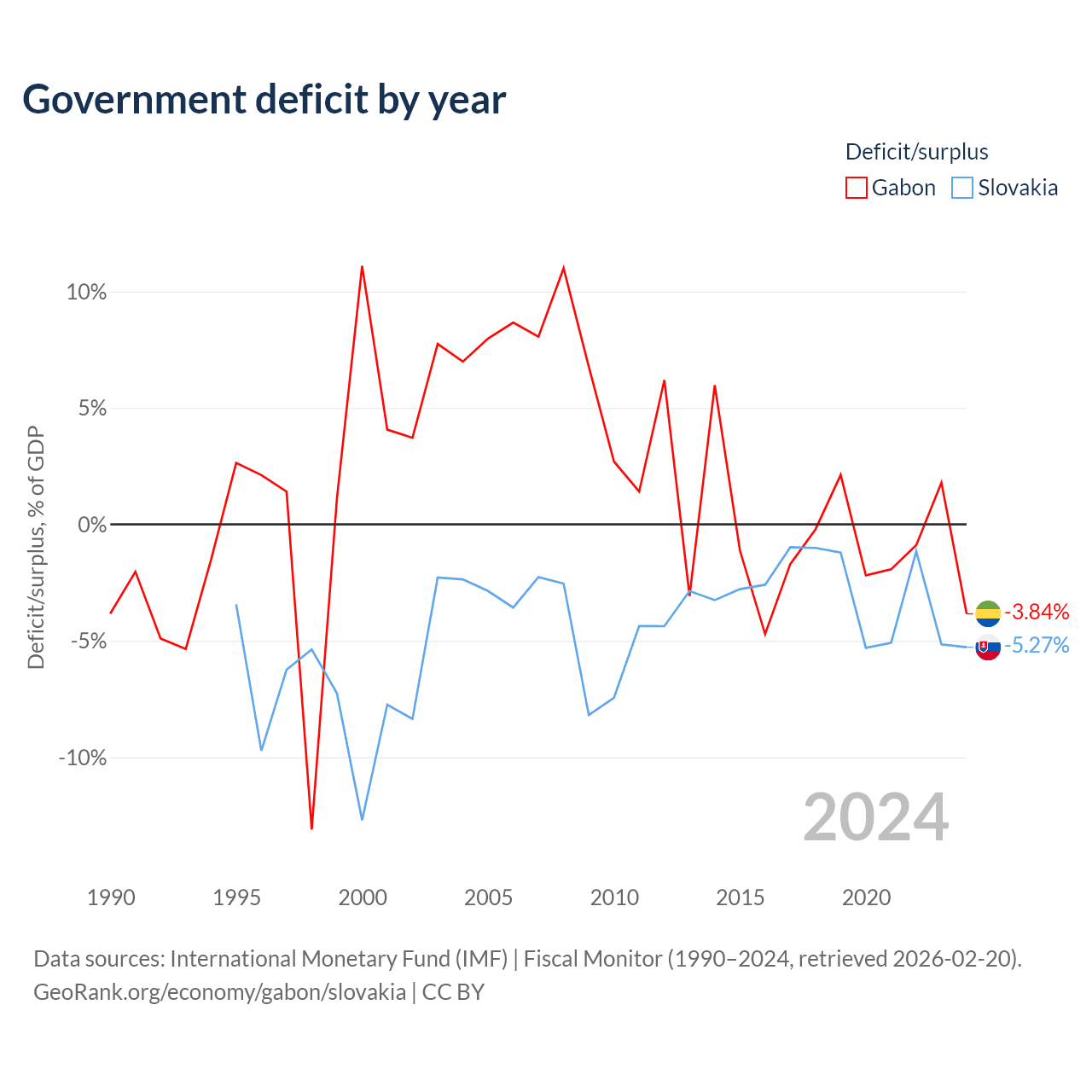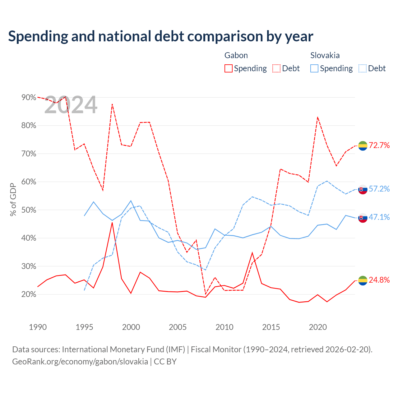 Gabon has $15.2B in government debt (72.7% of GDP), compared to $80.7B (57.2% of GDP) in Slovakia.