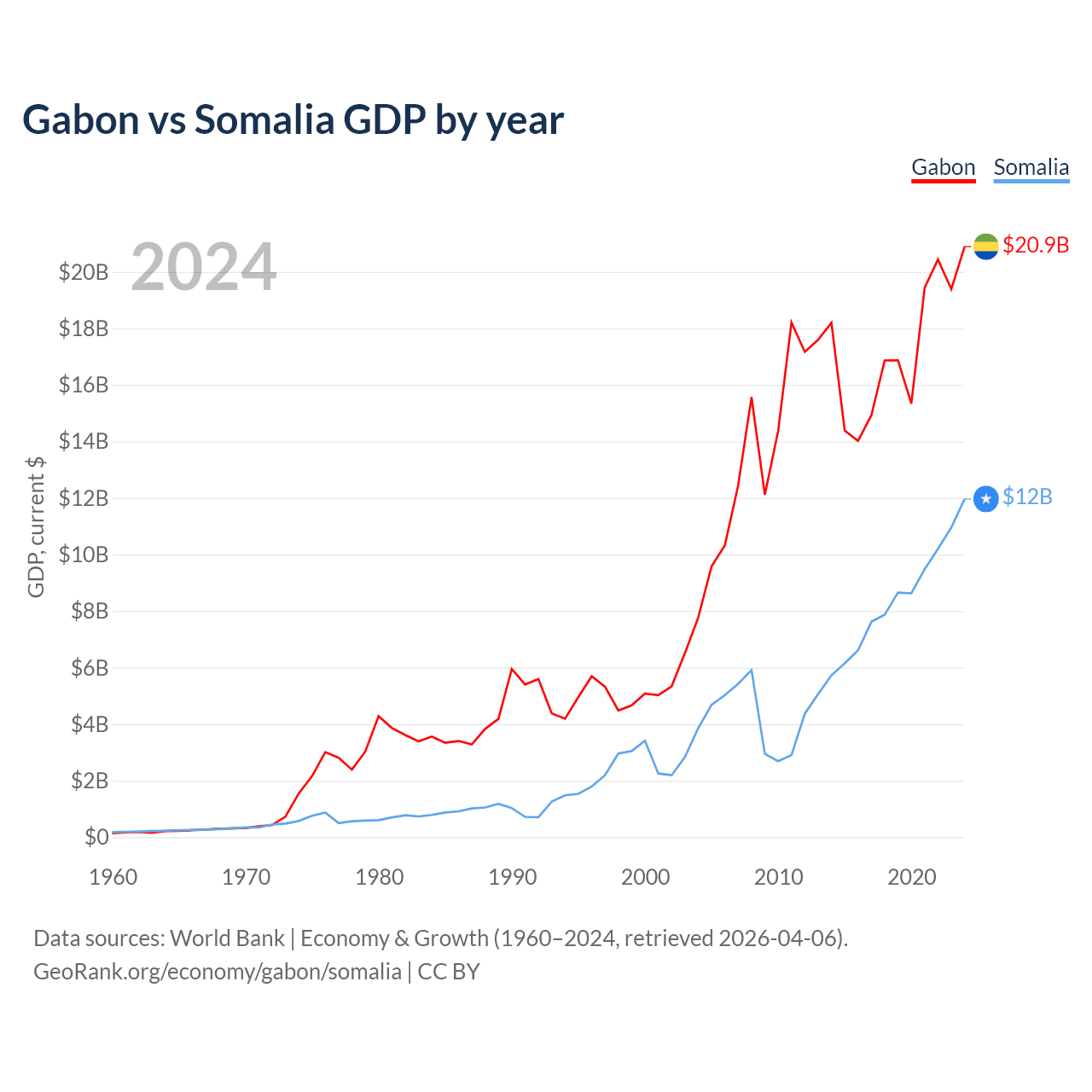 Gabon has a GDP of $20.9B compared to $12B for Somalia, ranking 127/197 and 150/197 by economy size, respectively.