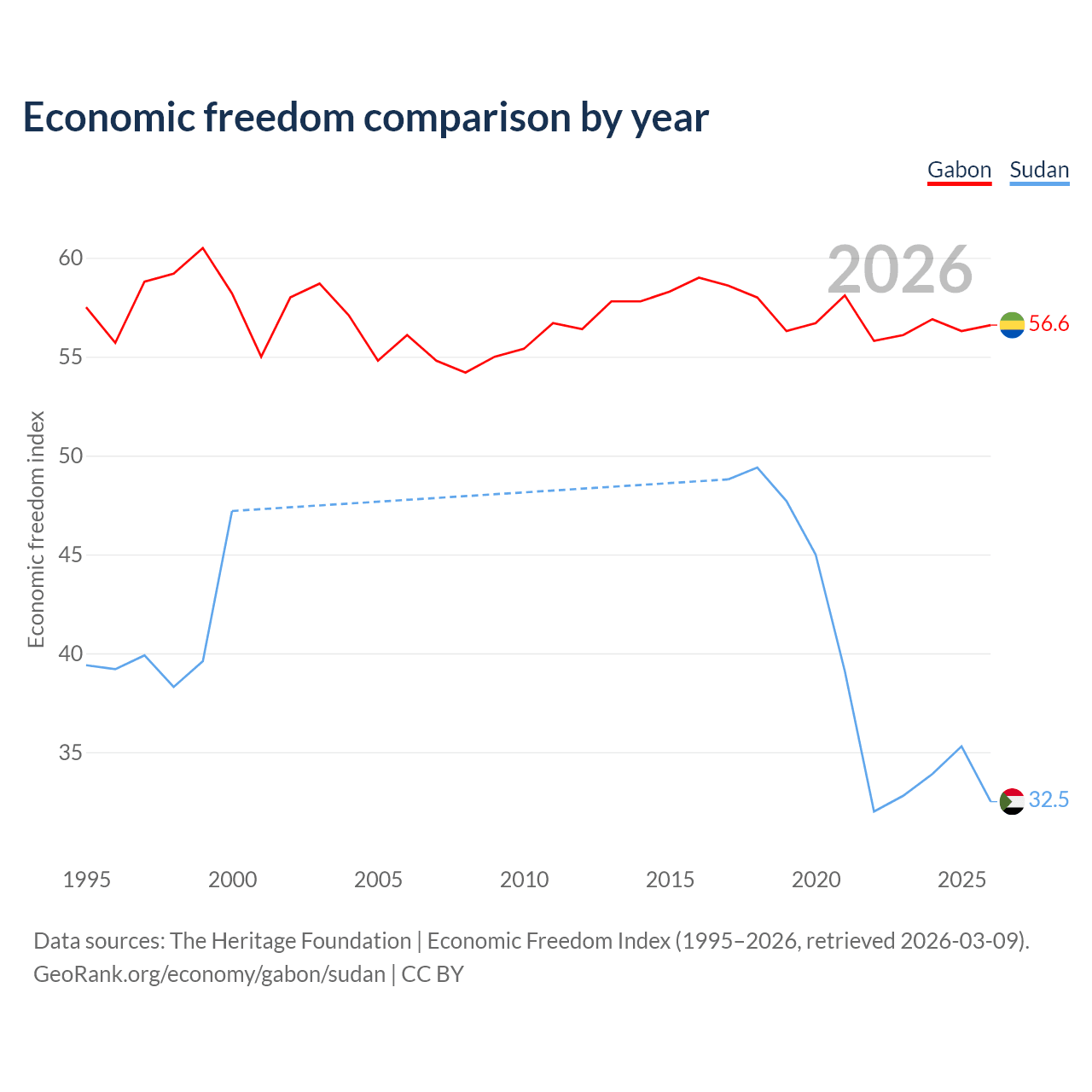The Economic Freedom Index for Gabon is 56.6, ranking 120/197, compared to 32.5 for Sudan, ranking 191/197. The chart above displays a comparison of annual changes in economic freedom indexes.