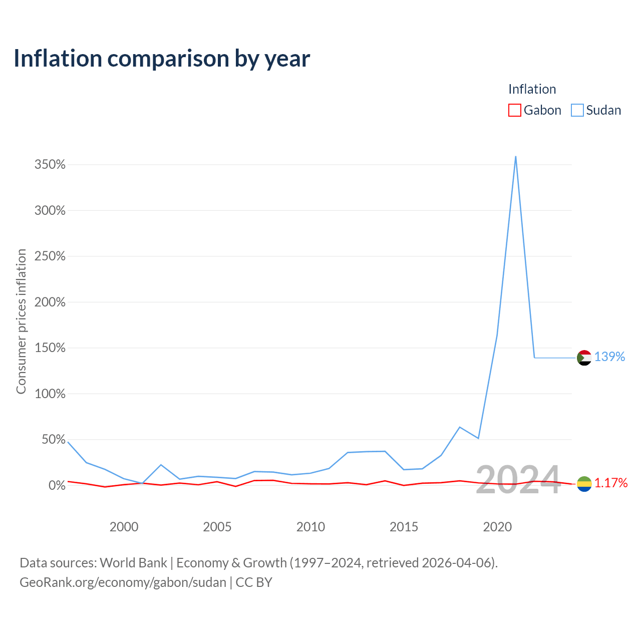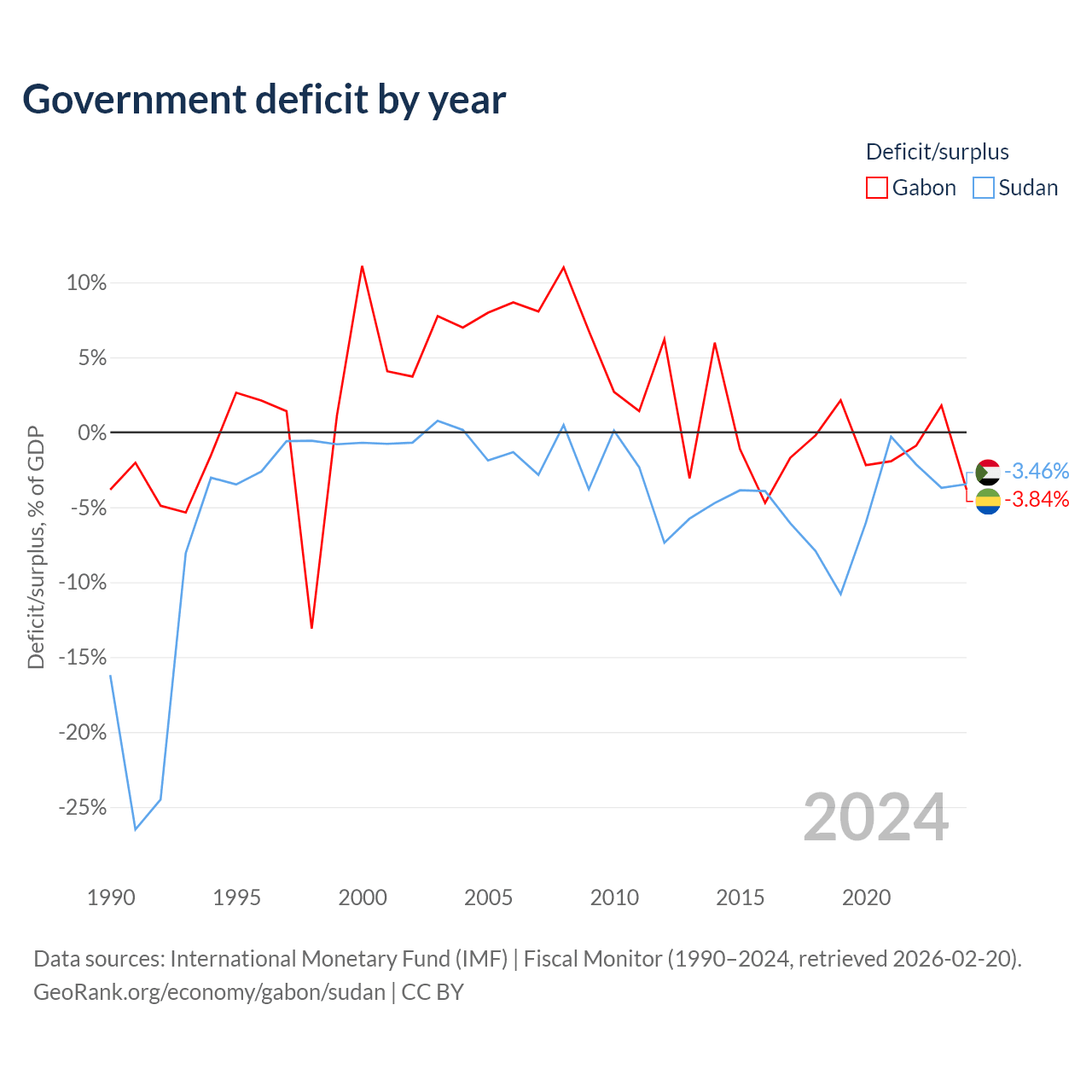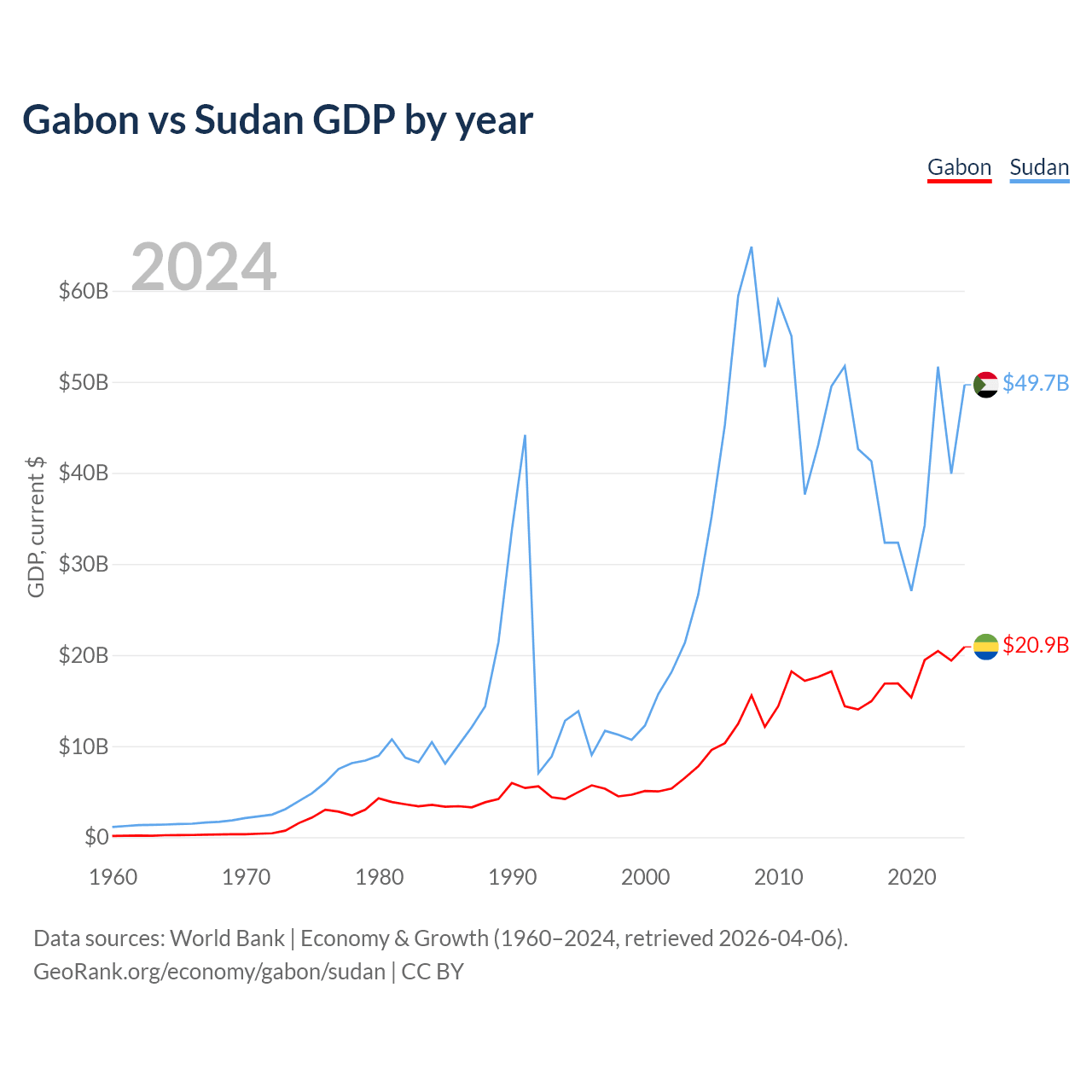 Gabon has a GDP of $20.9B compared to $49.7B for Sudan, ranking 127/197 and 94/197 by economy size, respectively.