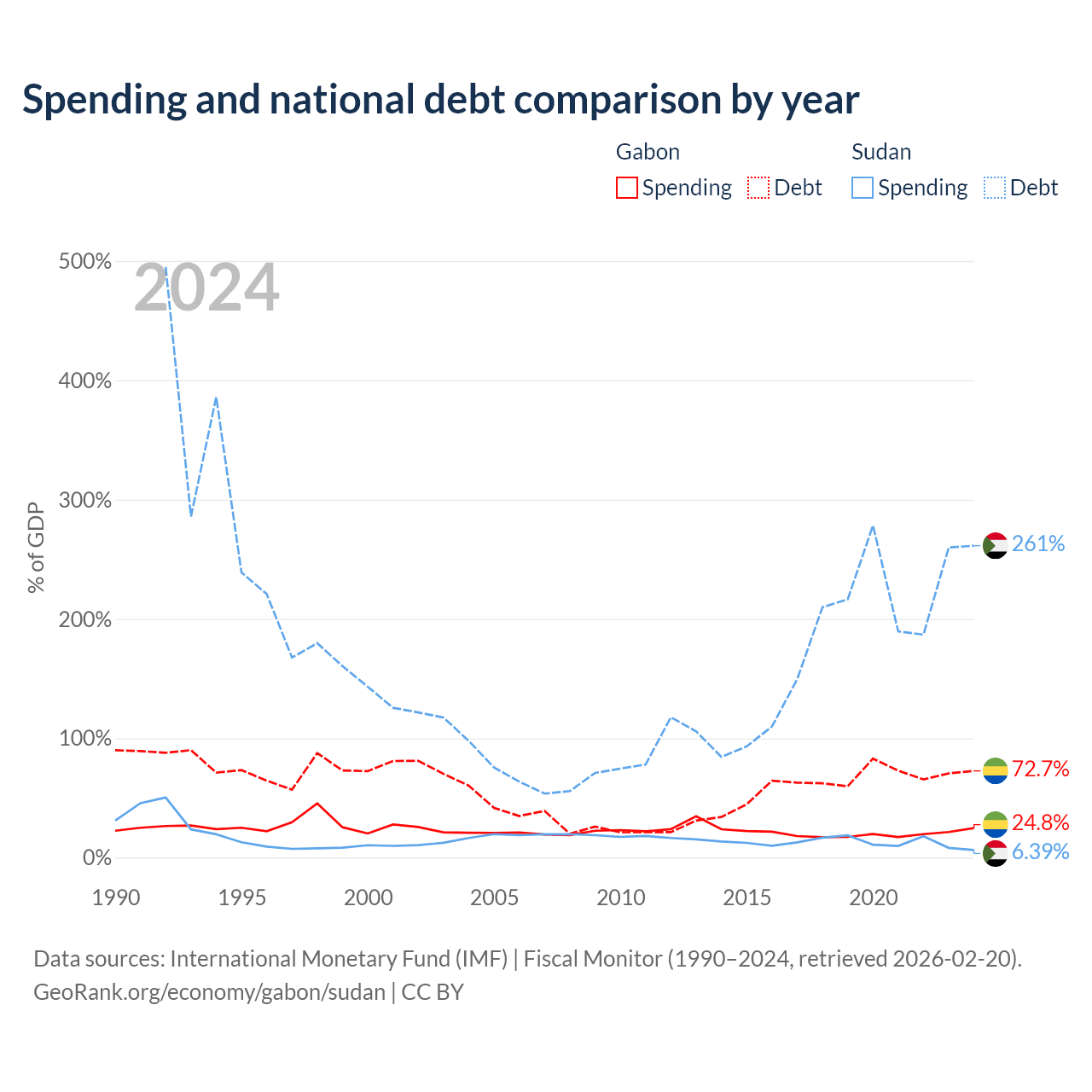 Gabon has $15.2B in government debt (72.7% of GDP), compared to $130B (261.4% of GDP) in Sudan.